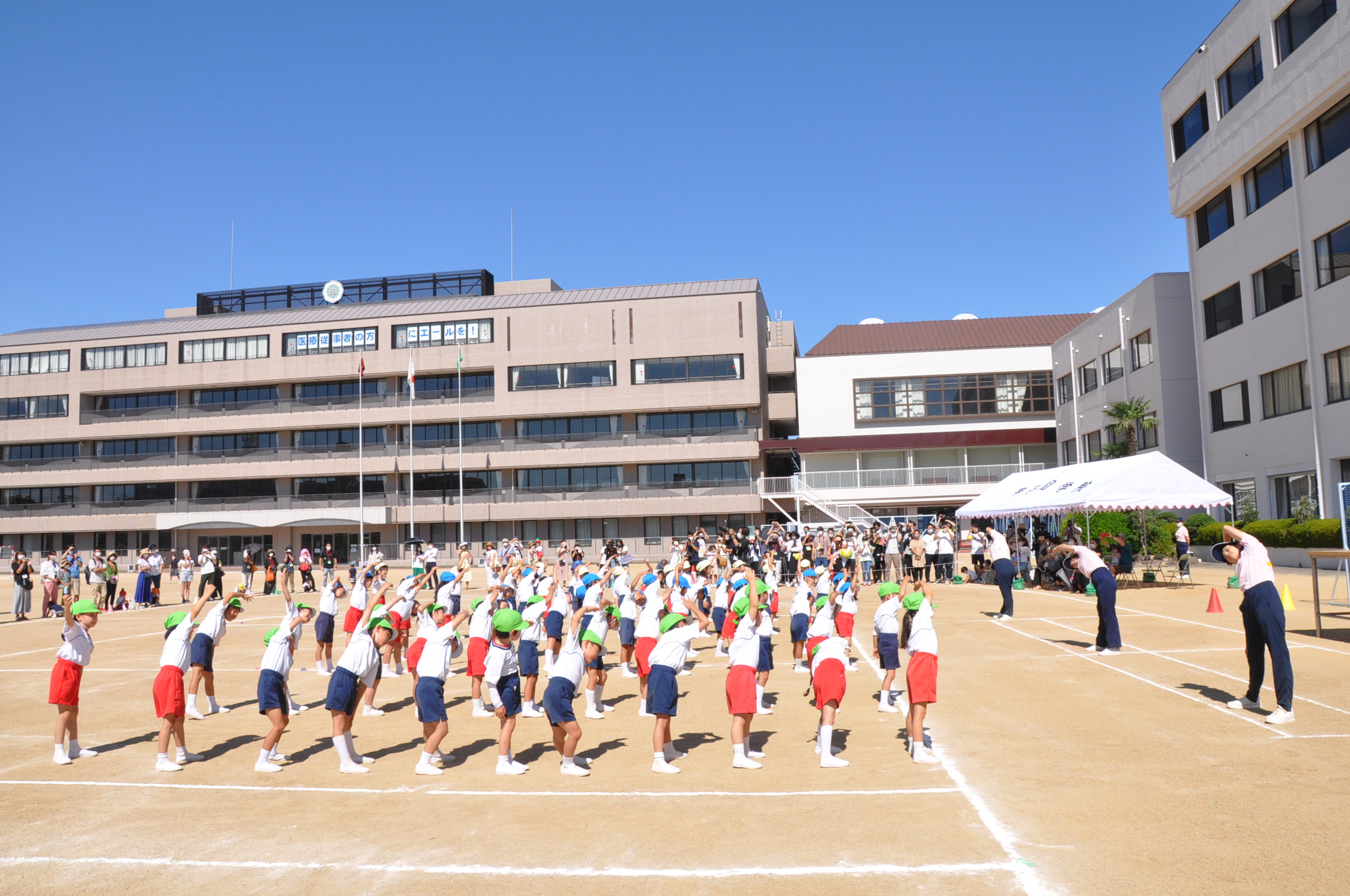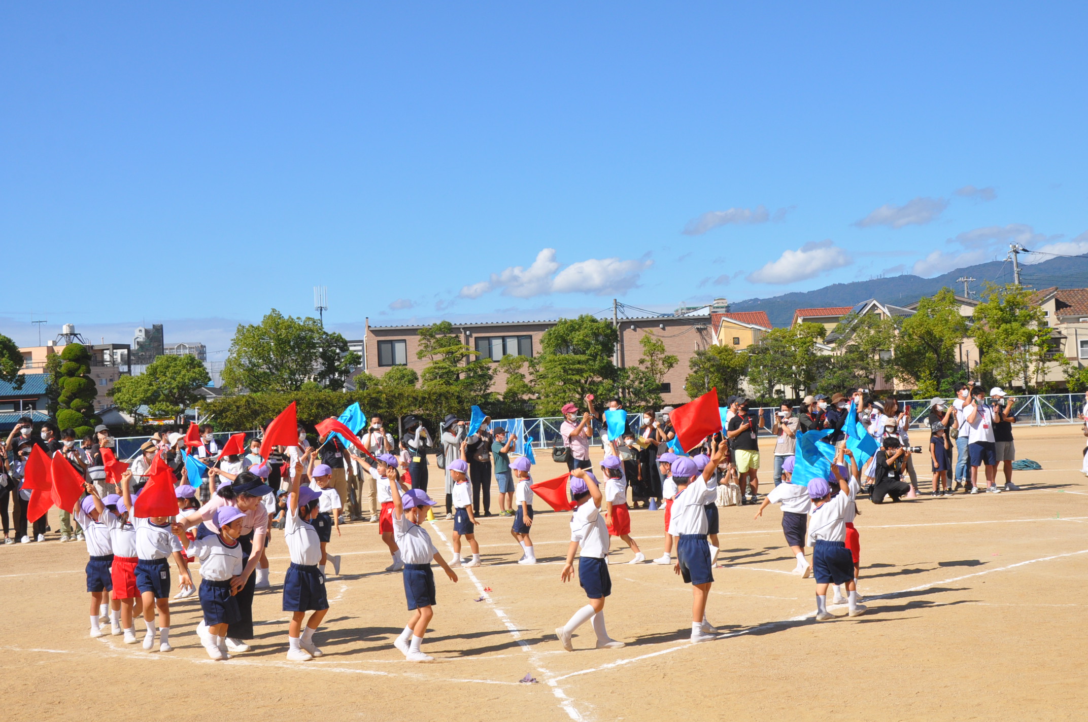 子どもたちは青空のもと,元気いっぱい演技や競技を披露しました。