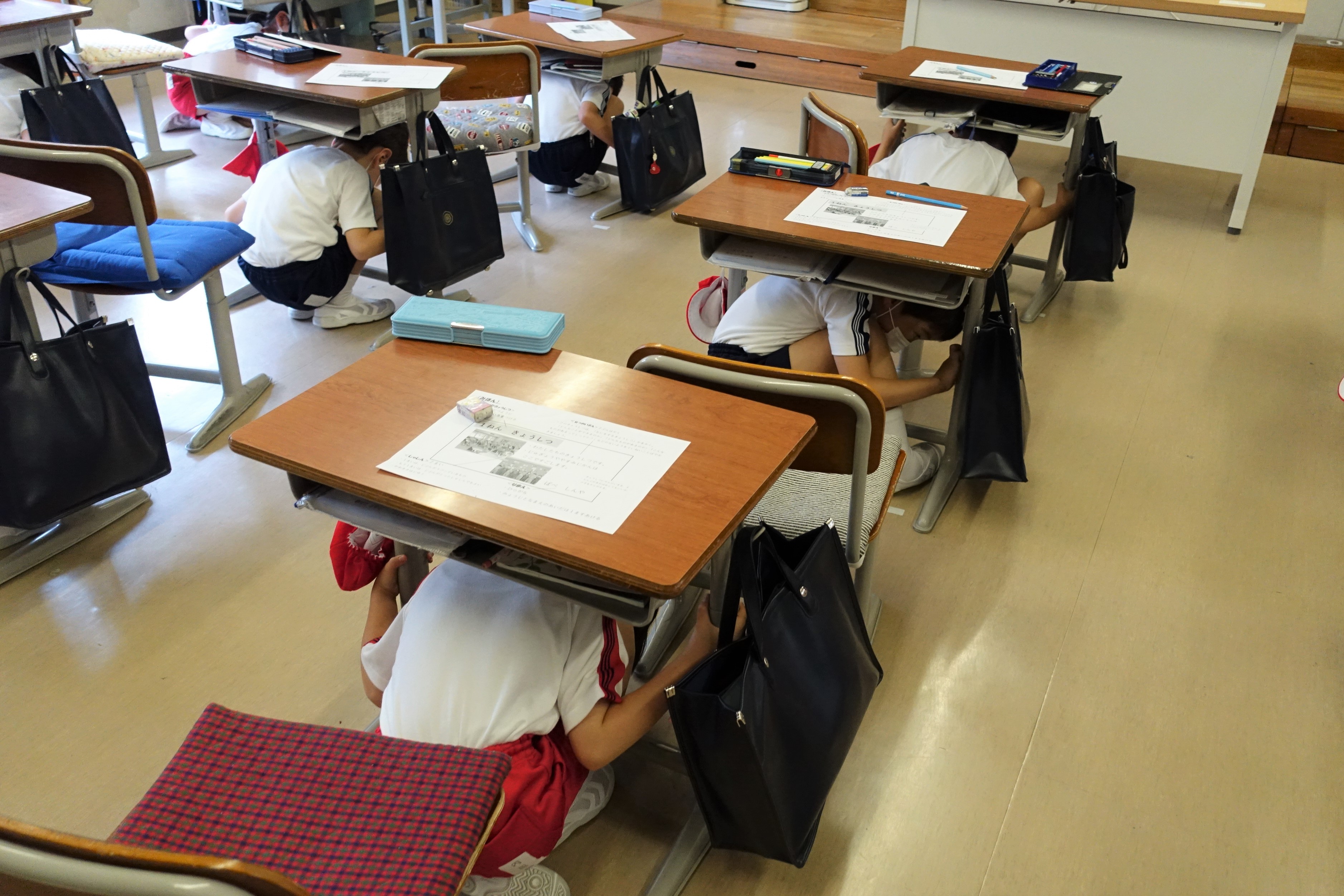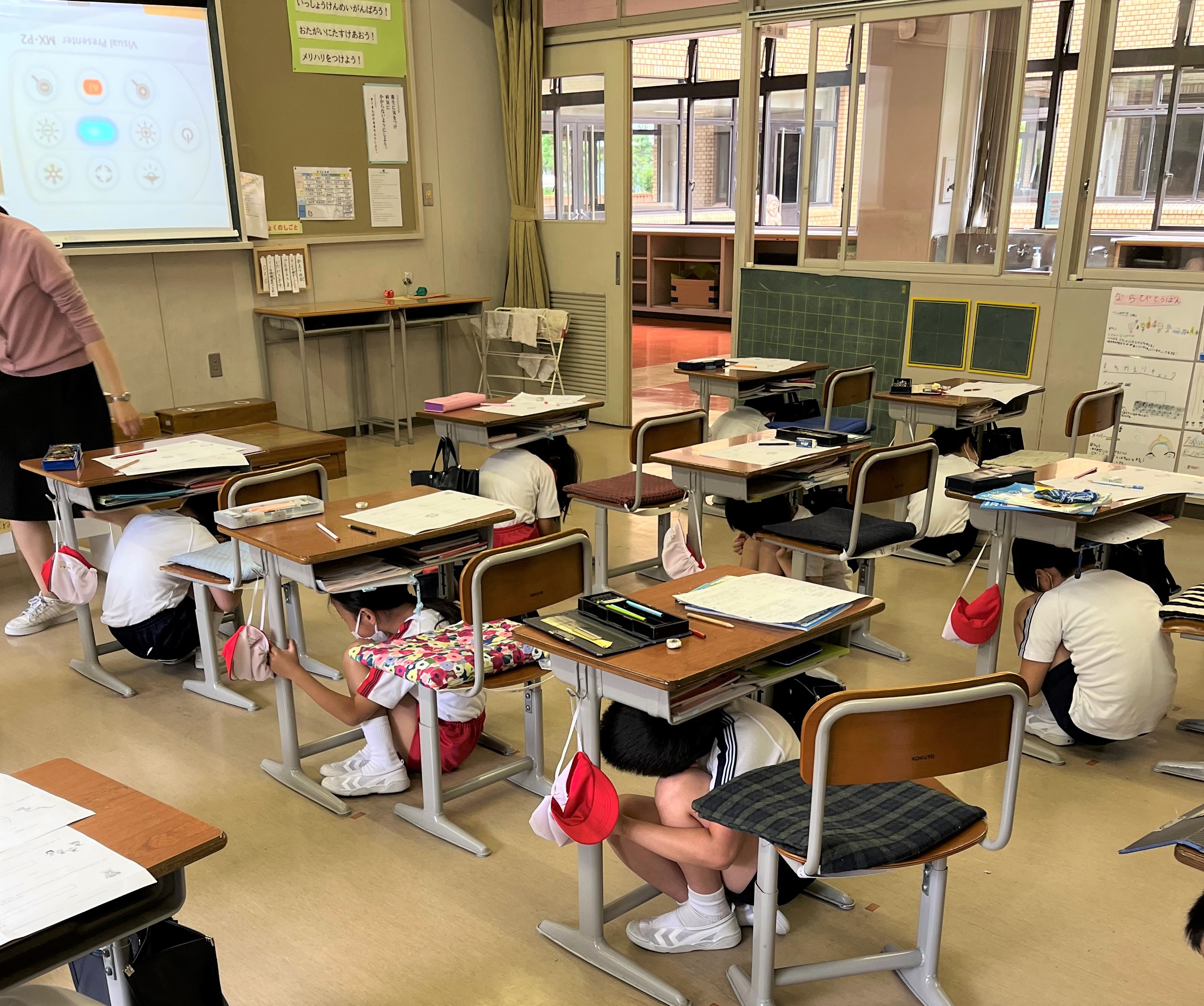 子どもたちは、防災スピーカー等の地震訓練放送に従って、机の下にもぐり頭部を守る姿勢を取りました。