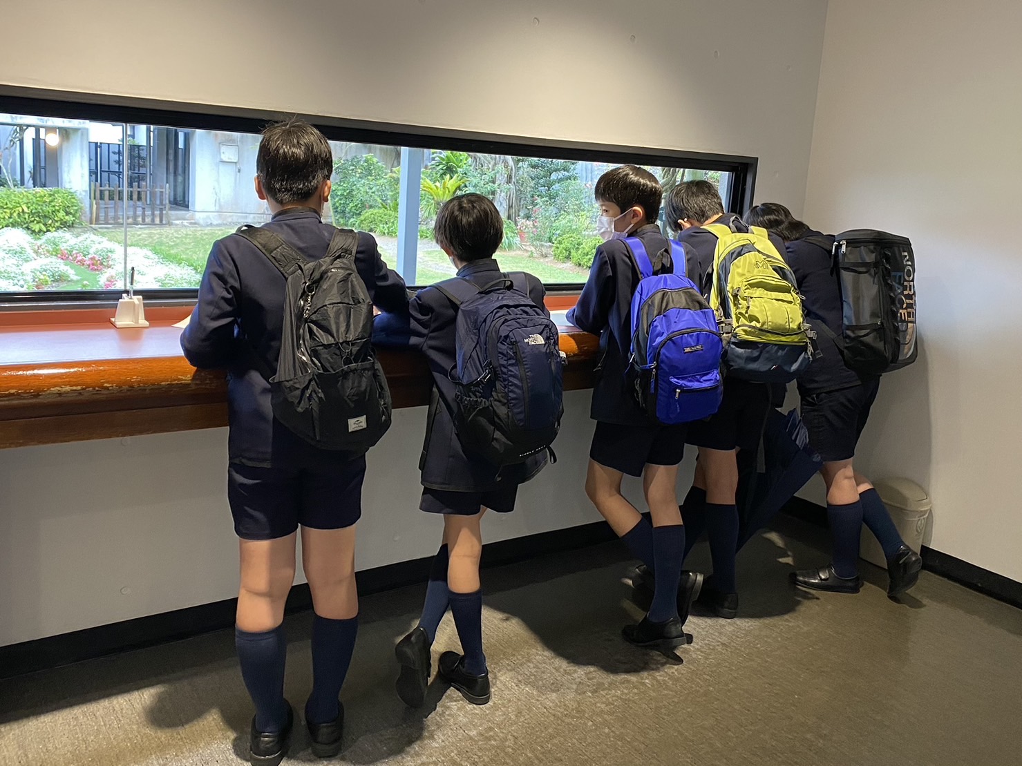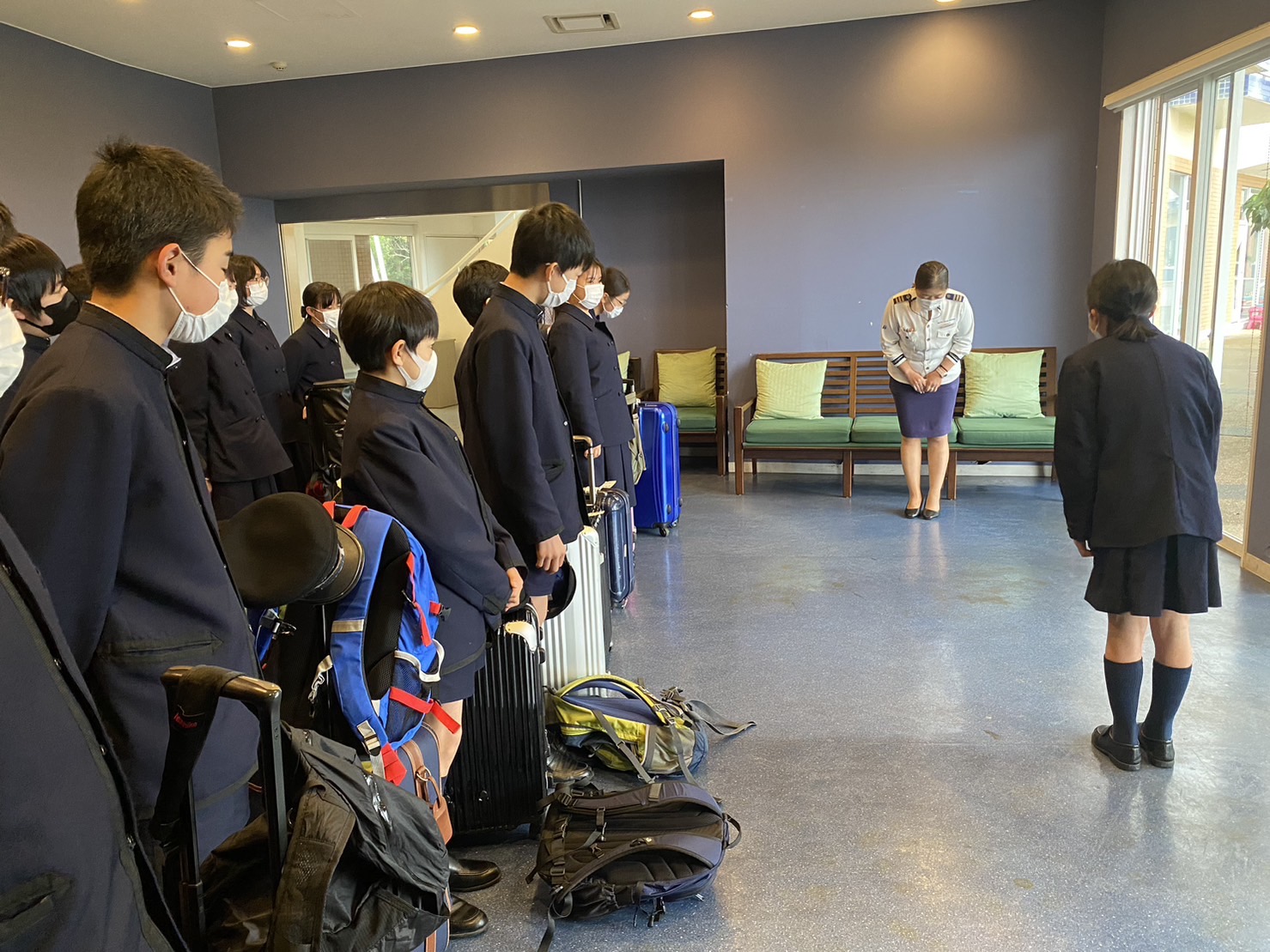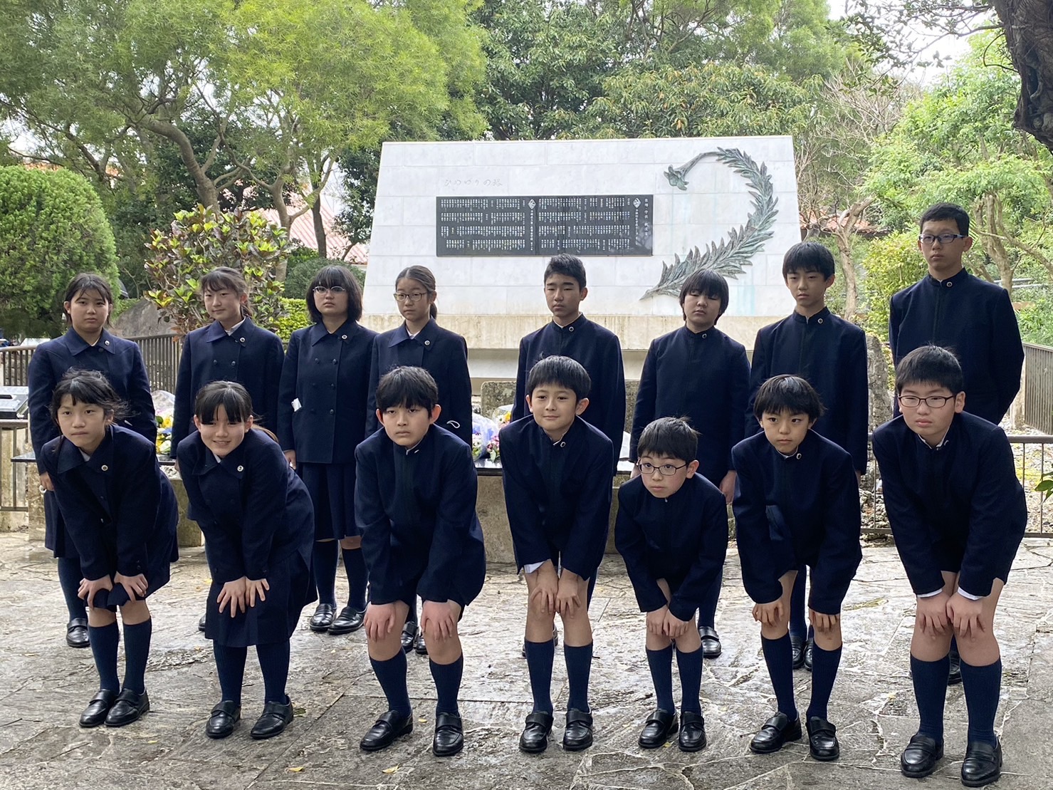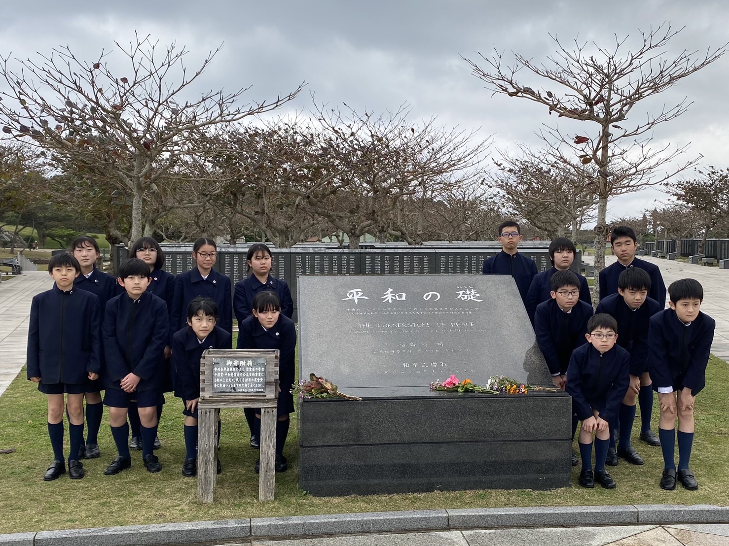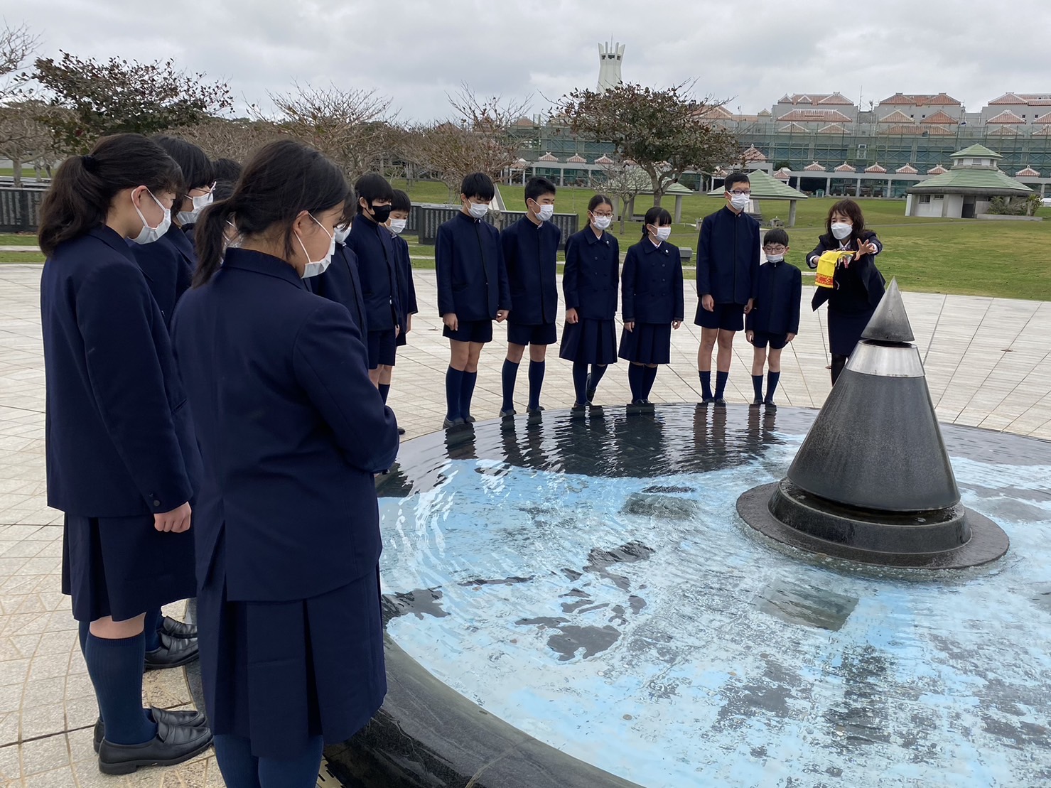 沖縄に到着しました。現地は暖かく、小雨の降る中でしたが、バスガイドさんの素敵なお話とともに移動し、充実した1日目となりました。本日は、ひめゆりの塔や平和祈念公園に行き、全員が平和について真剣に学習しました。それぞれが思い思いの気持ちを綴る場面もみられました。お昼は沖縄そばをいただきました。夕方には宿泊先のマリンピアザオキナワに到着しました。
