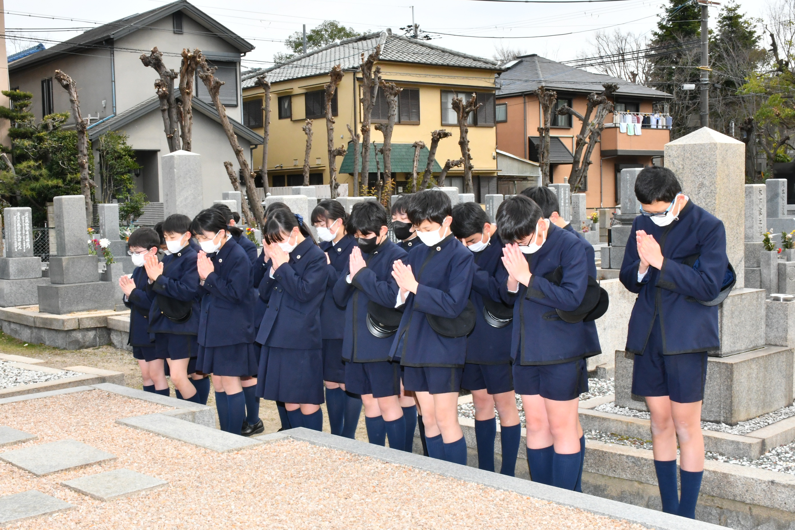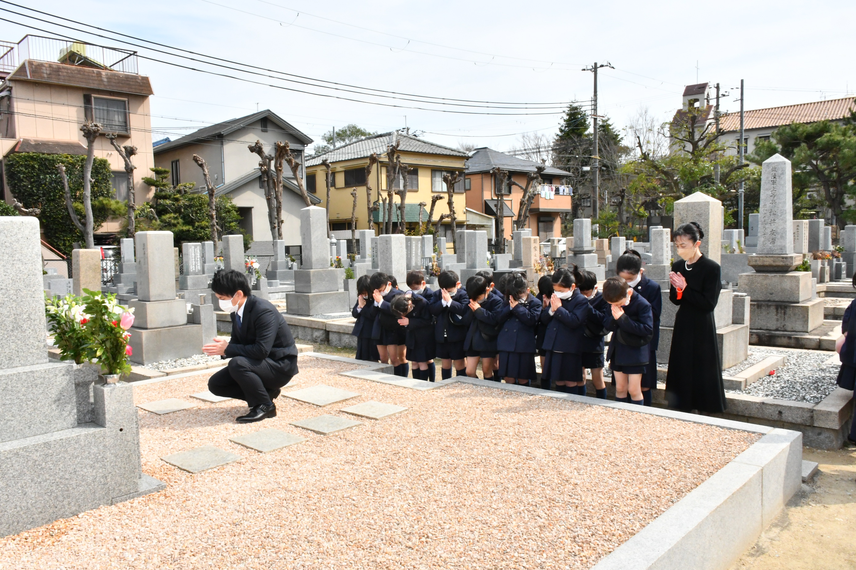 校祖先生と前学院長先生のお墓にお参りに行きました。先生方のご遺徳を偲んだ後、甲子園学院小学校の児童として、しっかり勉学に励むことをお誓いしました。