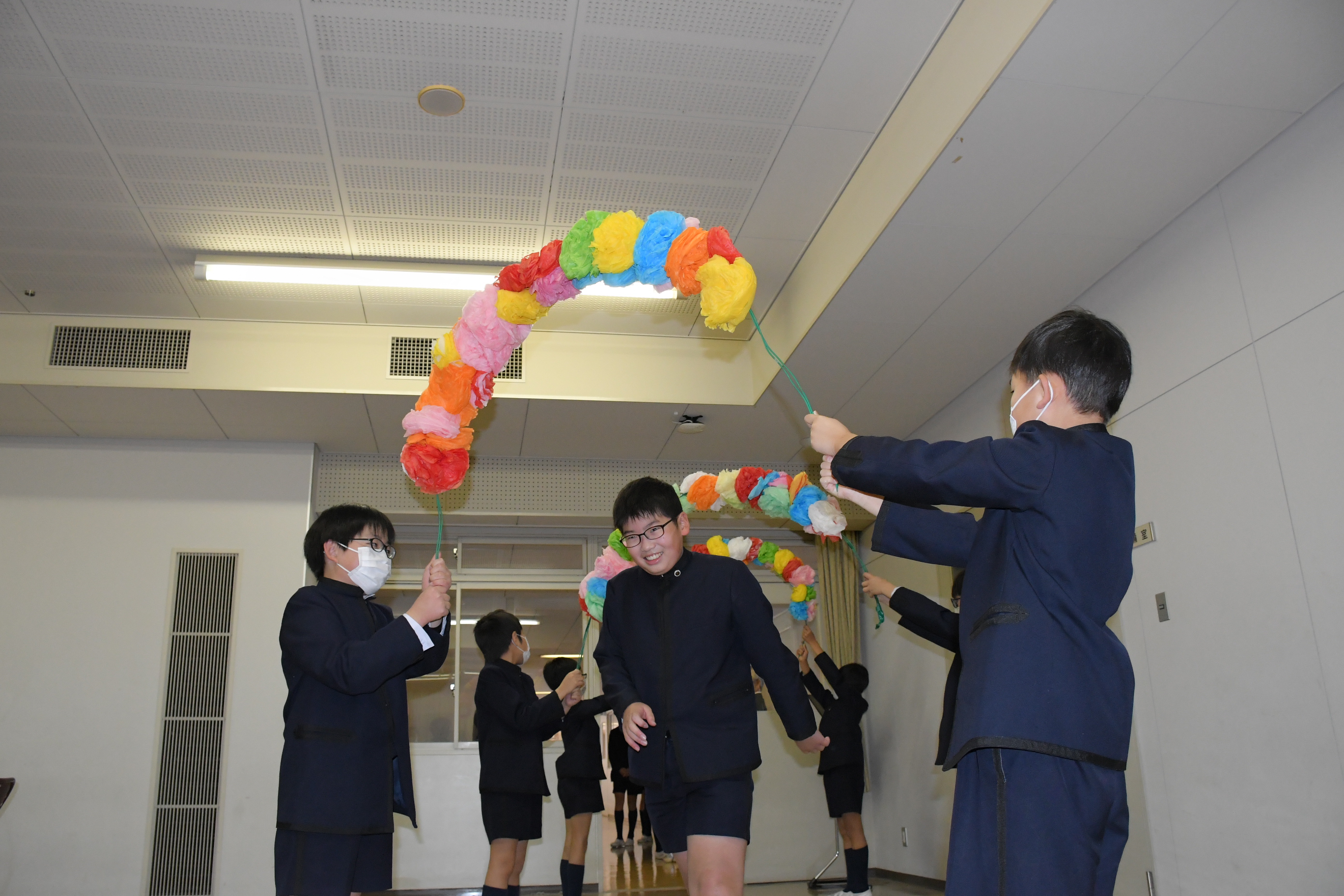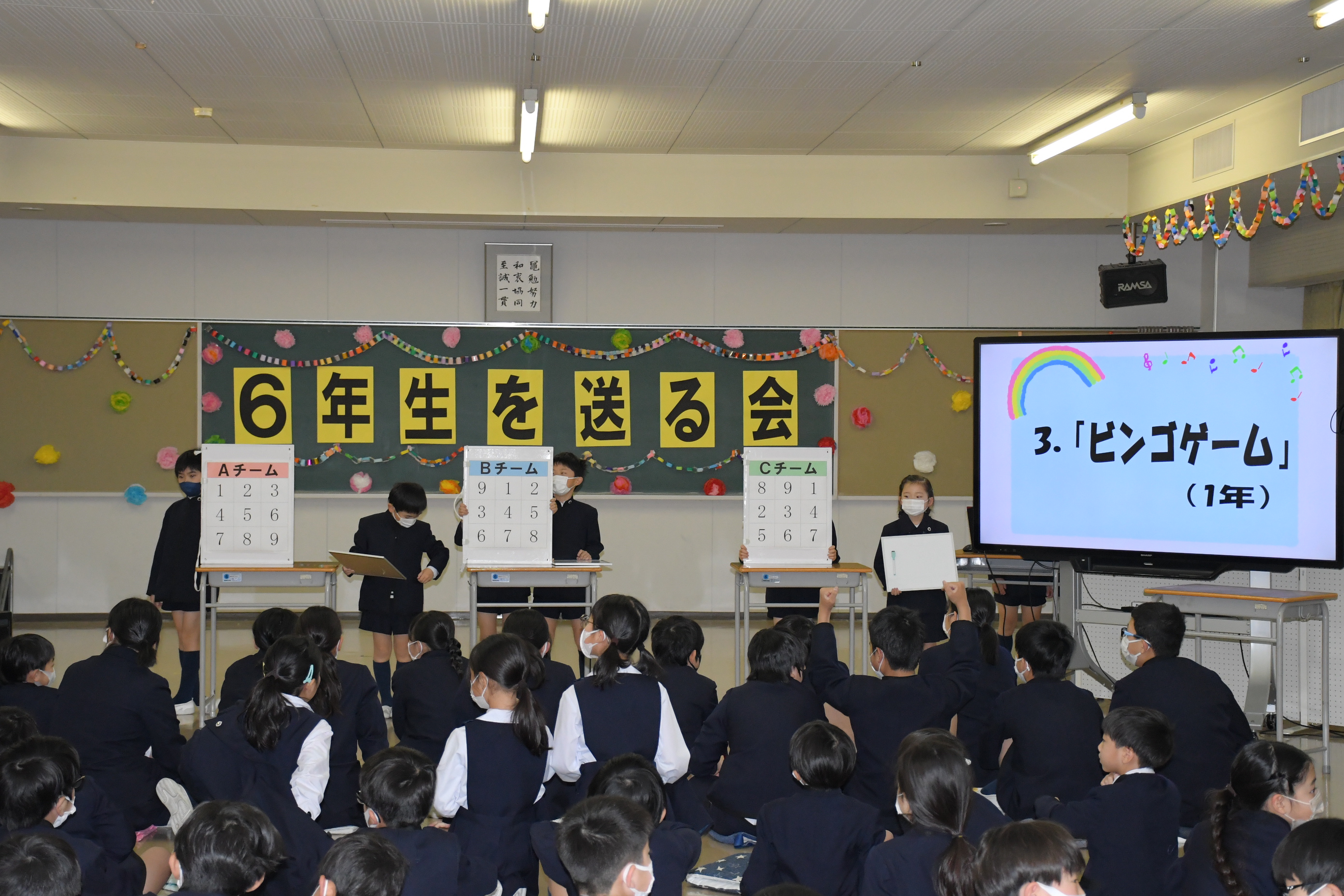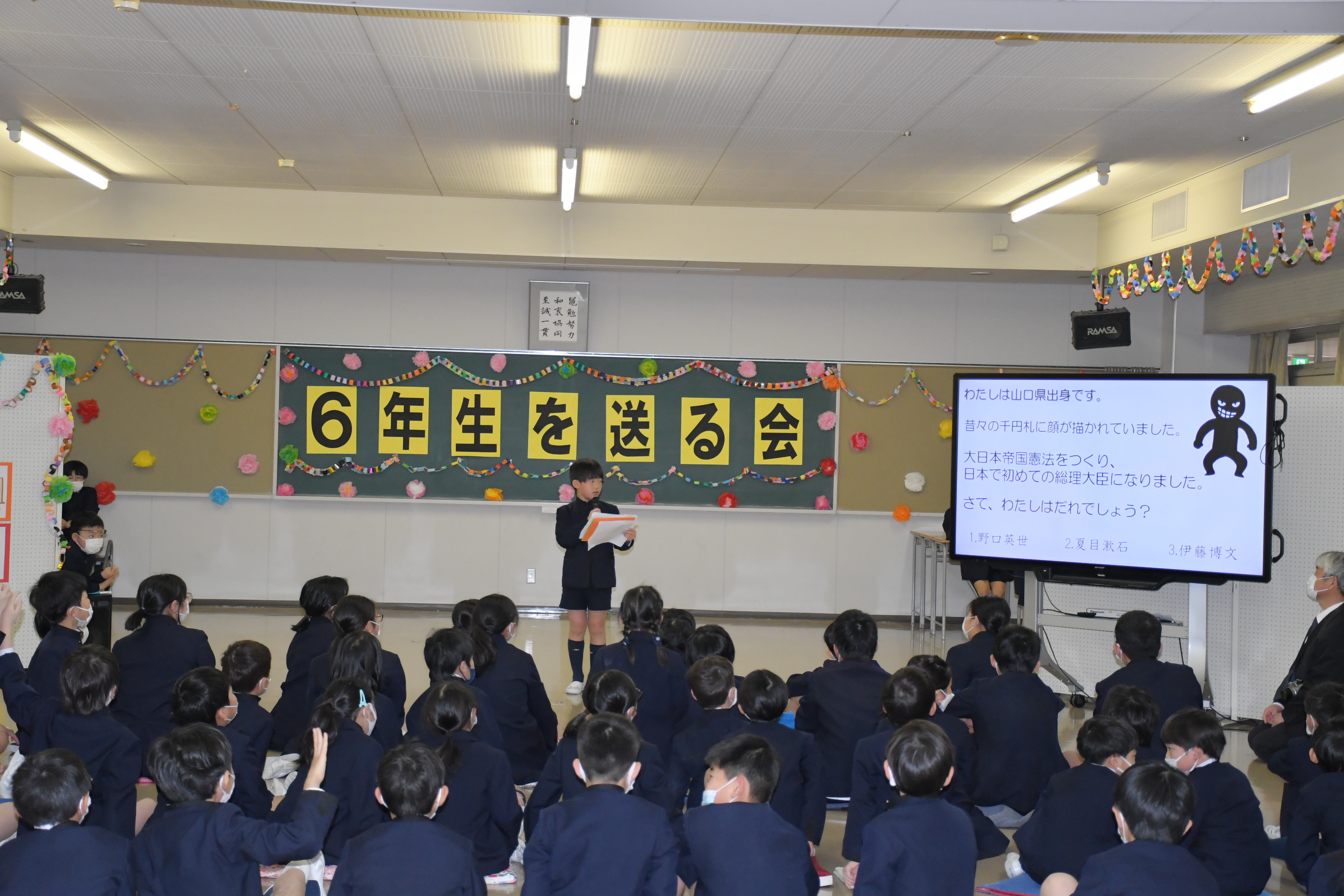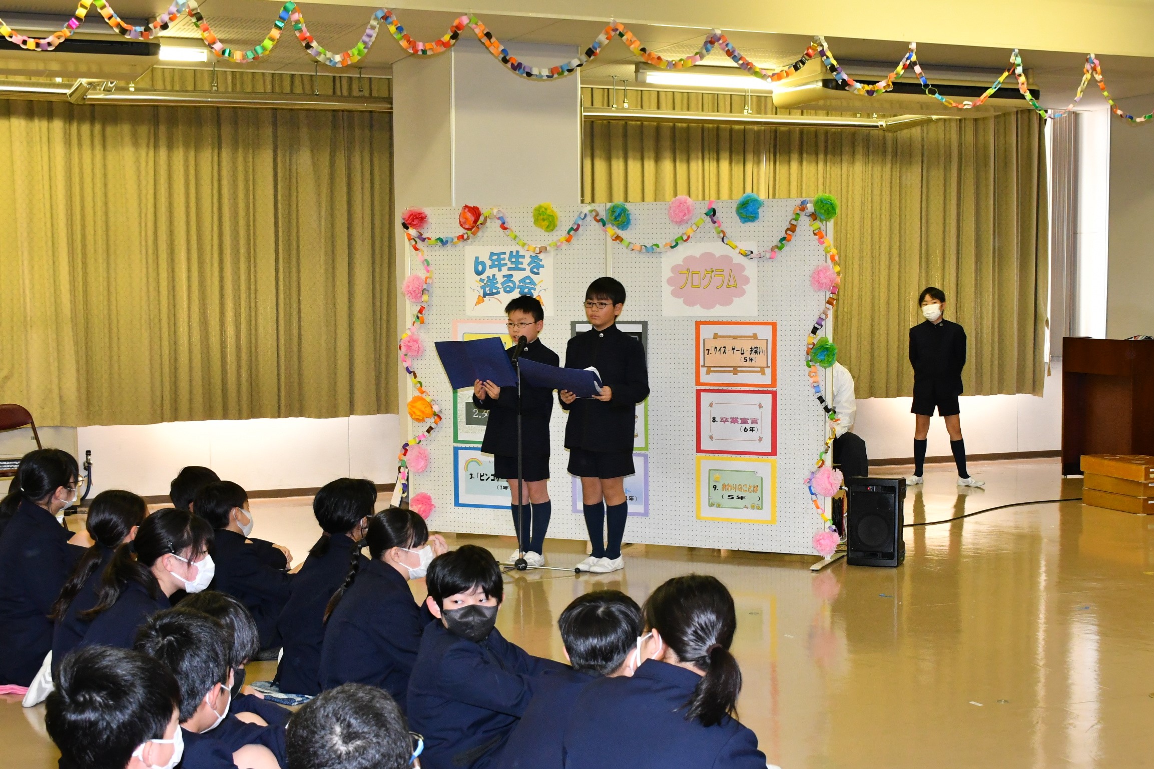 各学年が、6年生に楽しんでもらえるよう一生懸命考えたクイズやゲーム、お笑いなどを披露し、最後には6年生が一人ひとり卒業宣言を行いました。終了後は、昼食会を行いました。