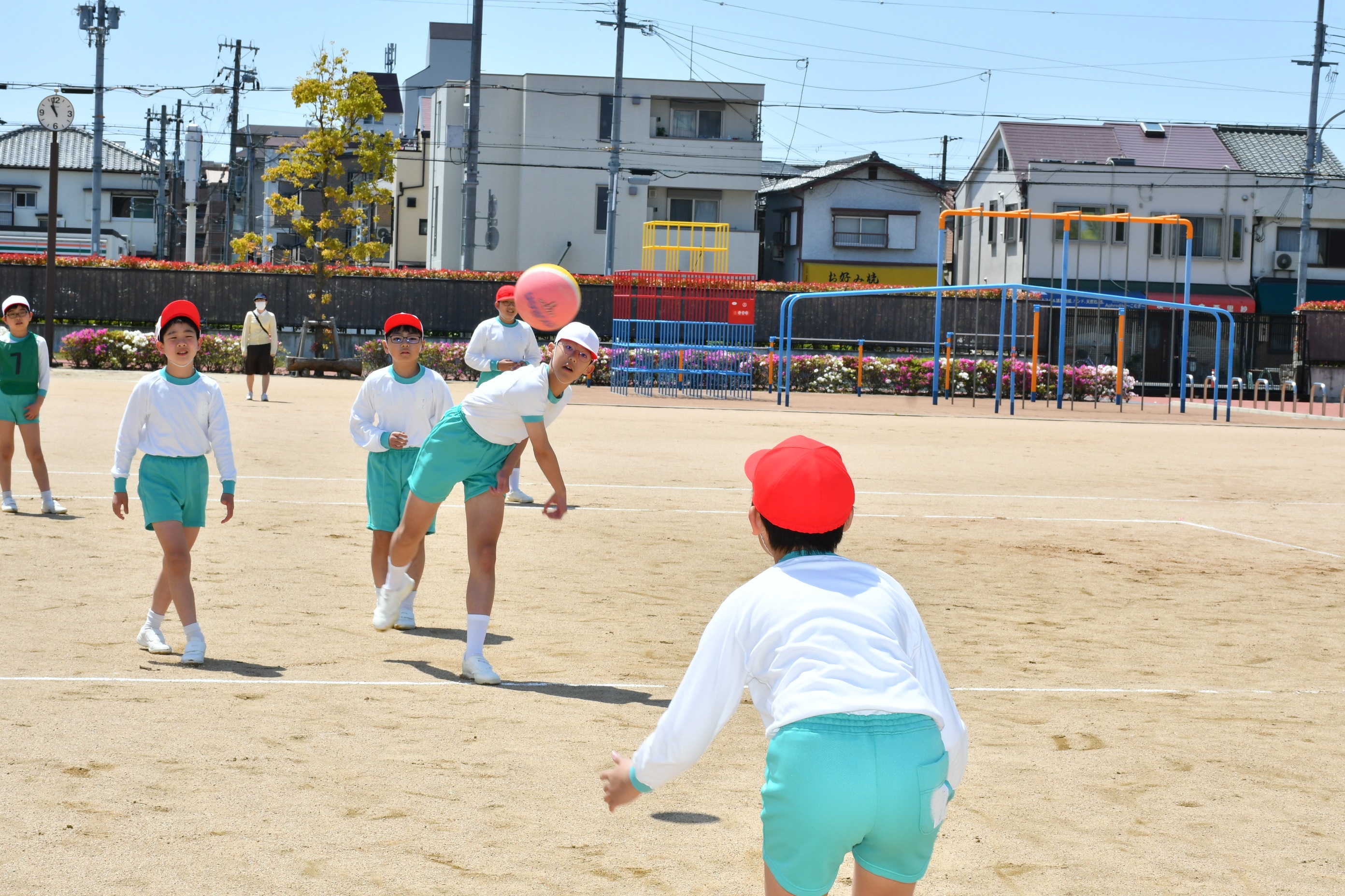 1・2年生は転がしドッジボール、3・4年生はドッジボール、5・6年生は王様ドッジボールを行いました。