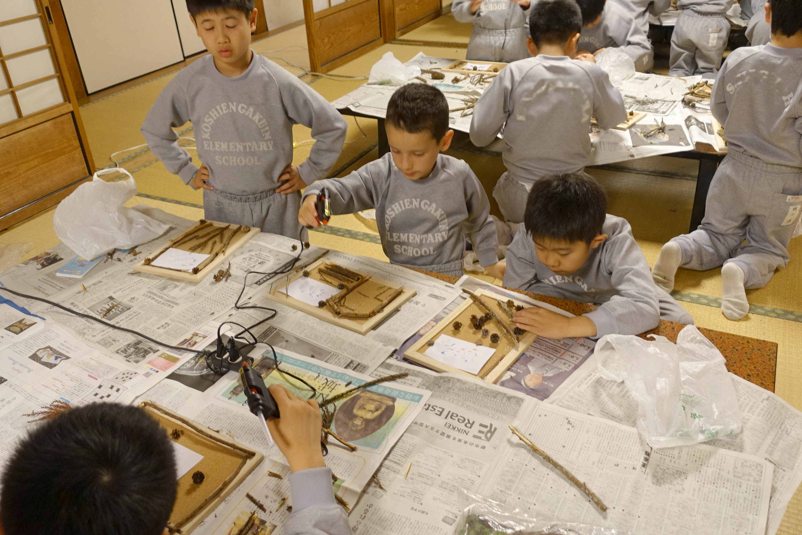 夕食後にはハイキングで集めた材料でフォトフレーム作り。みんな,思い思いの作品を仕上げました。