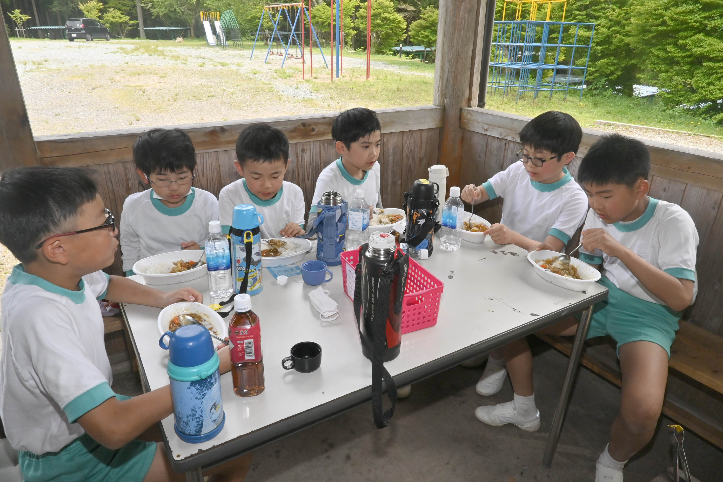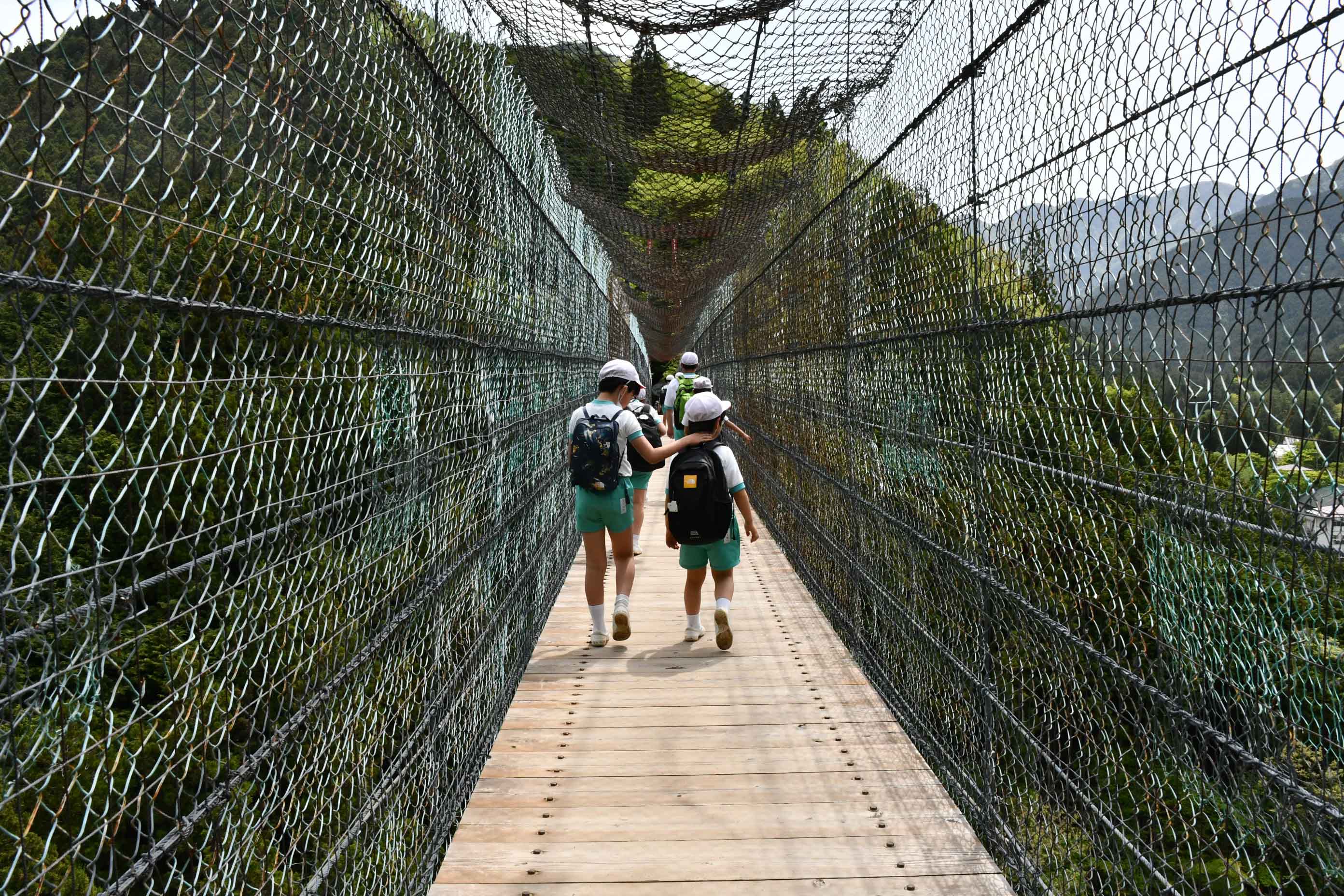 高さ50mのつり橋「かりがね橋」を渡ったら,一度下山し野外炊爨。5年生の作ったカレーは最高で,みんなおかわりしてペロリと完食しました。