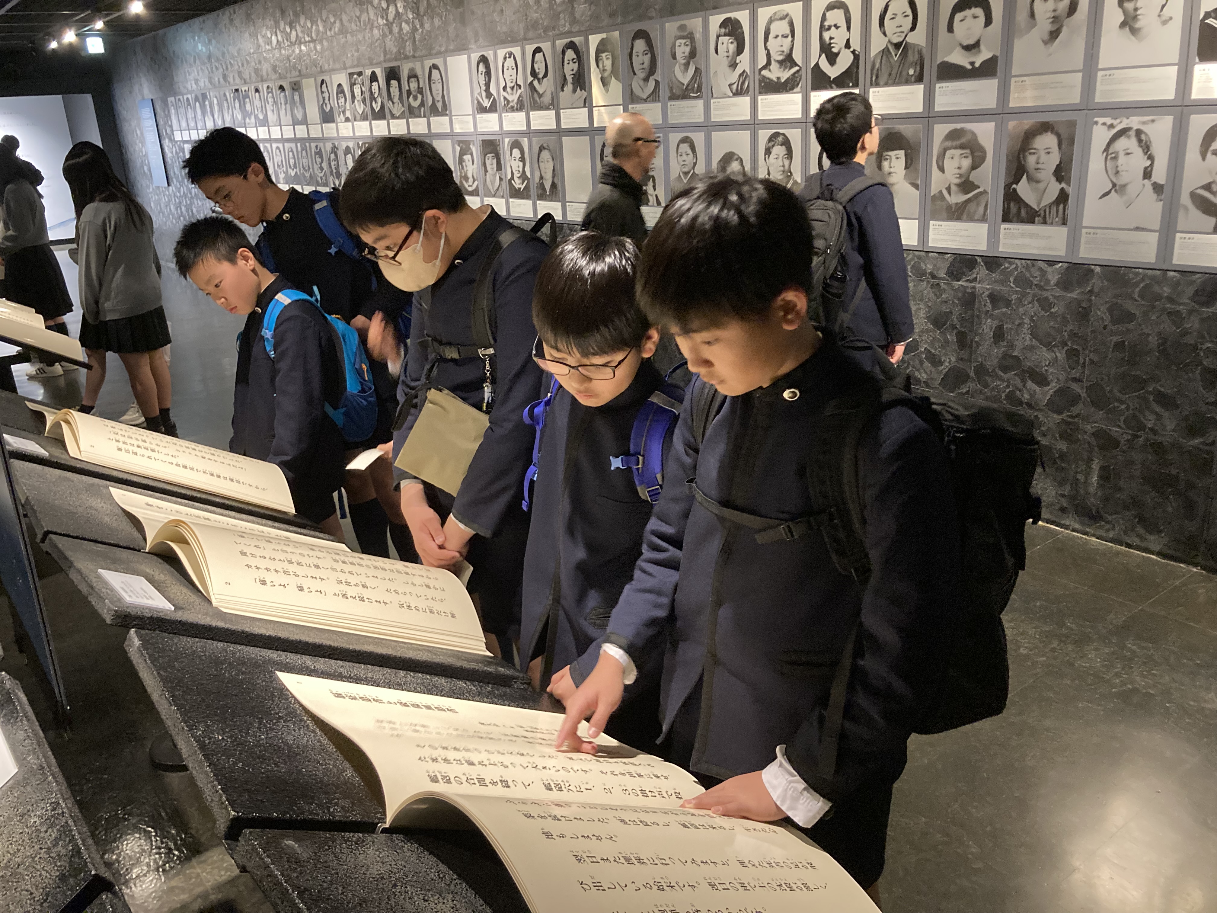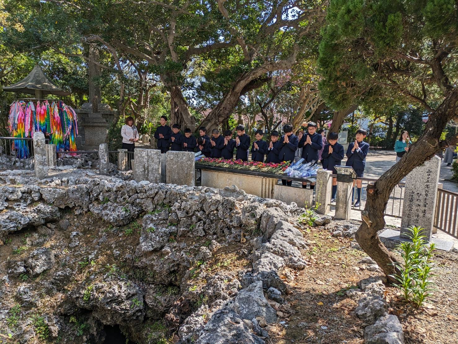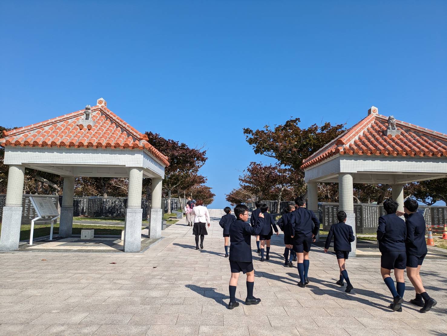 沖縄に到着しました。現地は暖かく、沖縄らしい晴天に恵まれました。バスガイドさんの素敵なお話とともに移動し、充実した1日目となりました。本日は、ひめゆりの塔や平和祈念公園に行き平和学習を行いました。戦争で亡くなった方々に想いを馳せ、祈りを捧げました。平和祈念資料館では真剣に展示物を見る児童の姿が印象的でした。お昼には沖縄そばをいただき、夕方には宿泊先のマリンピアザ沖縄に到着しました。