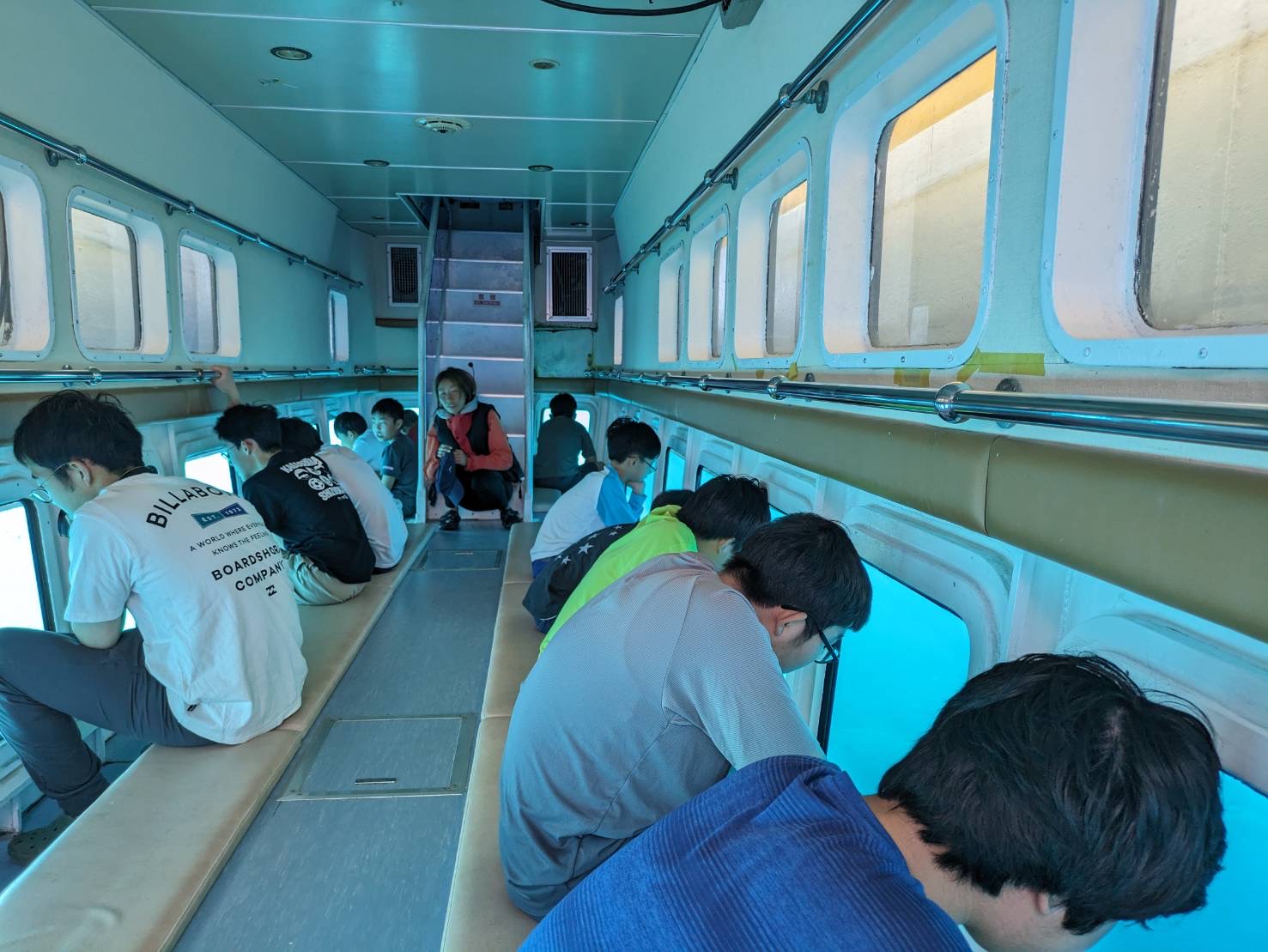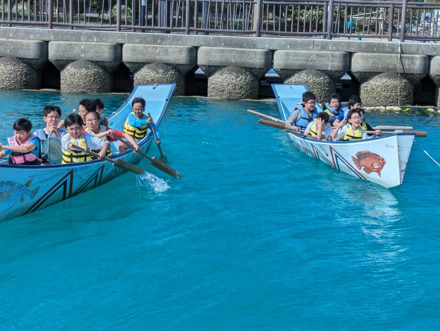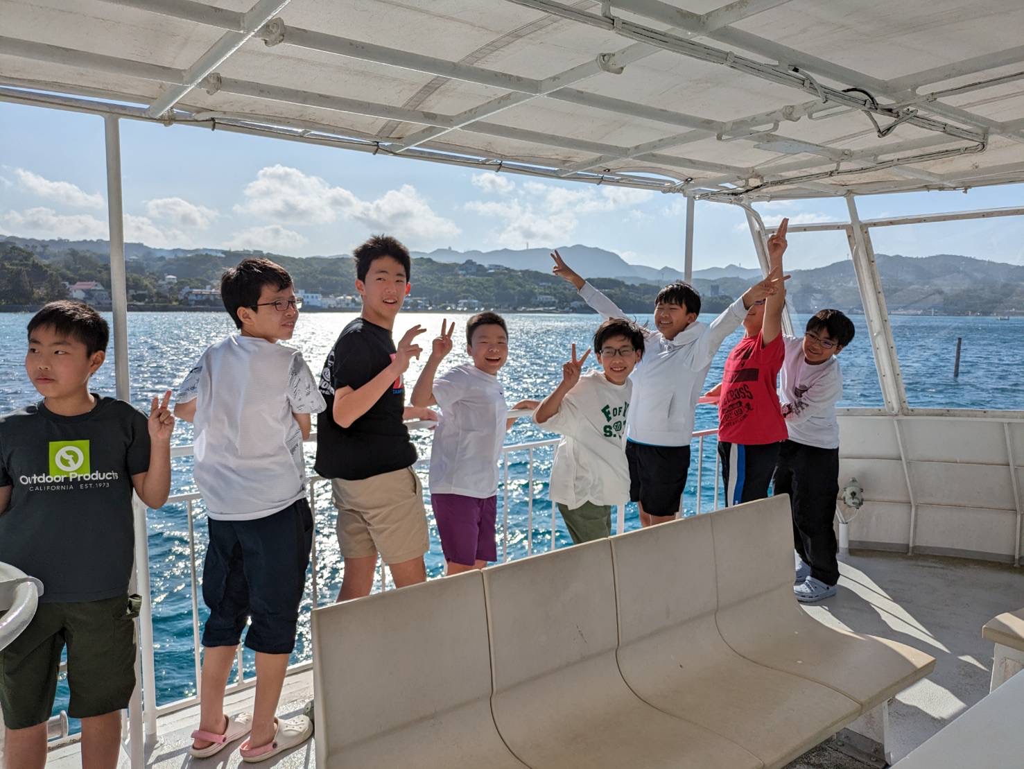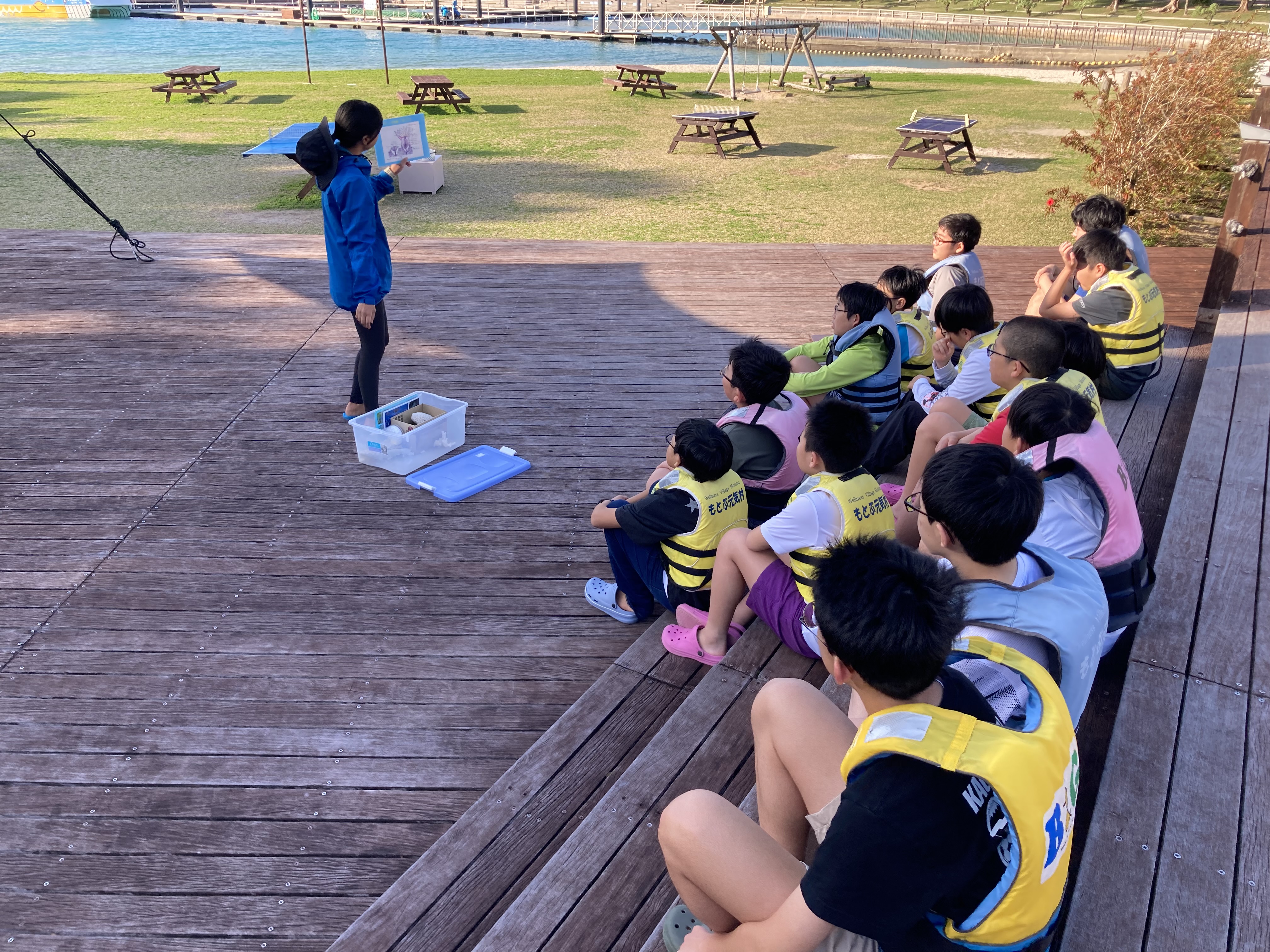 本日は朝から「もとぶ元気村」に滞在し、1日かけて海洋プログラムを楽しみました。午前中はドルフィンガイド・コーラルビュークルージング・サンゴ風鈴作りをしました。お昼はカレーをいただき、午後からは、カヌー・サバニ・バナナボートを体験しました。その後干潮の浜辺で生き物探しを行い、ホテルに帰ってからもバドミントンや卓球などを楽しみました。青い海と豊かな自然のなか、全員で元気に活動することができました。