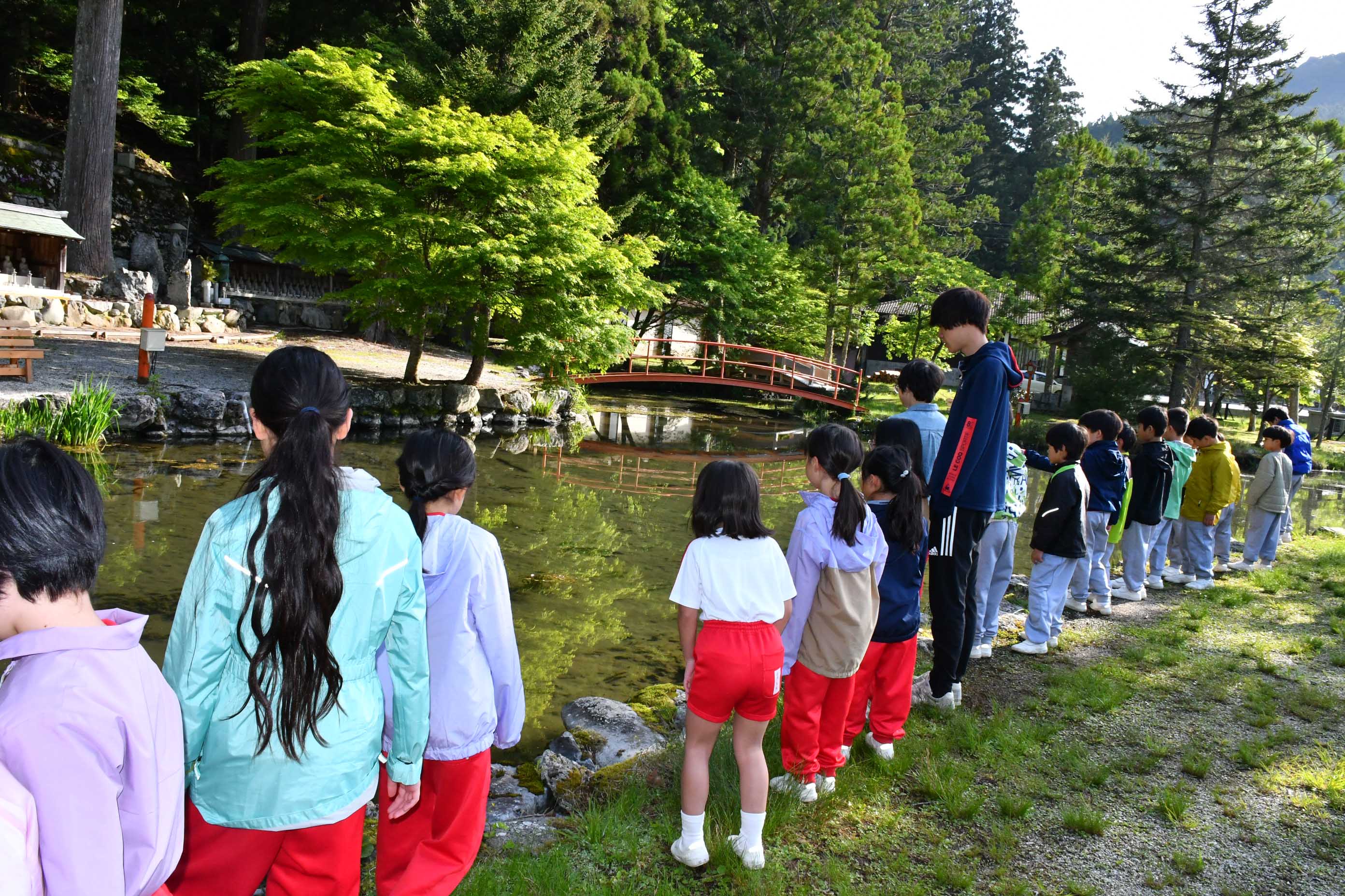 今朝の天川村は晴れ。朝の集いの後で集合写真を撮ったり,境内を散策したりしました。