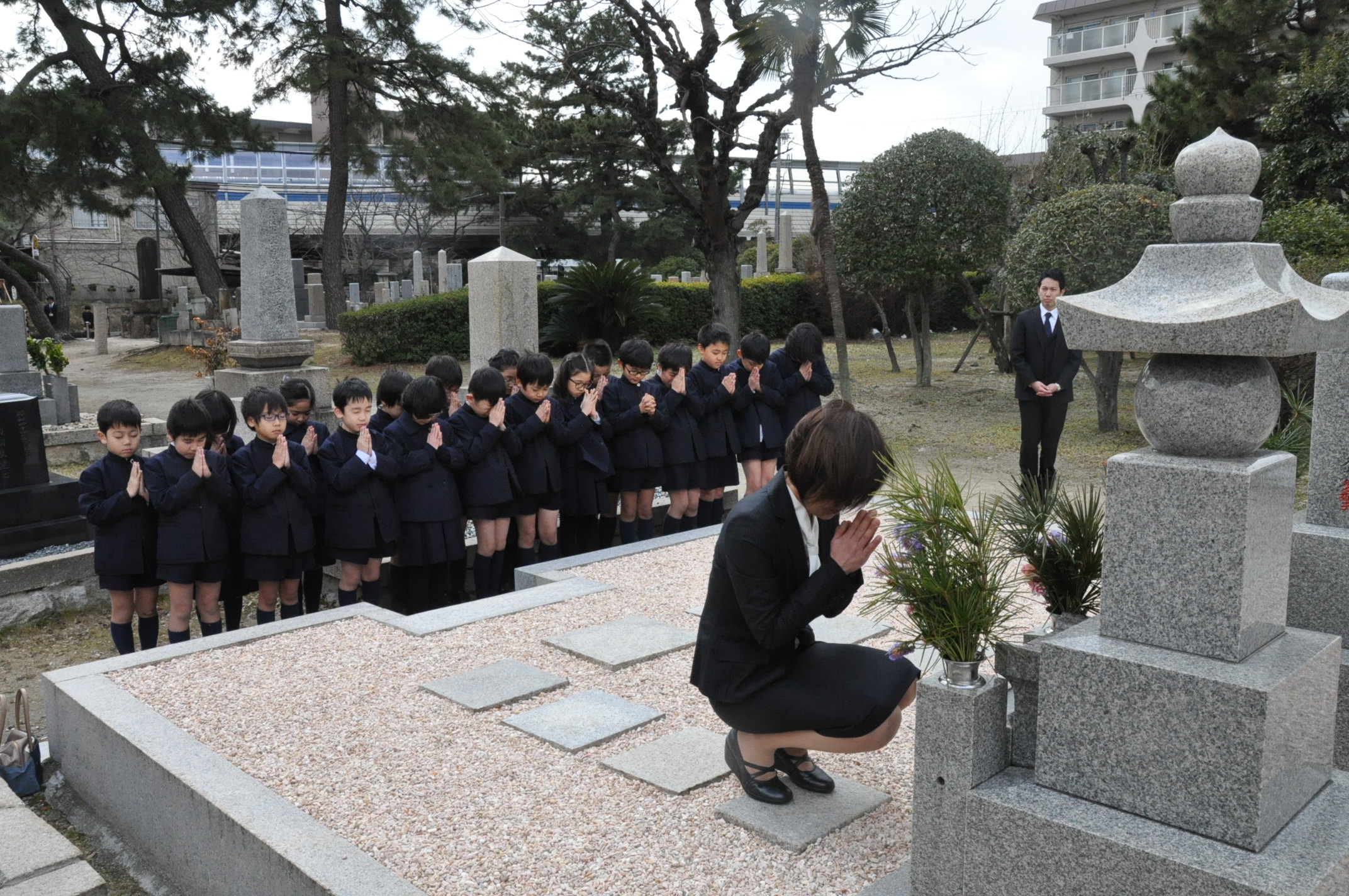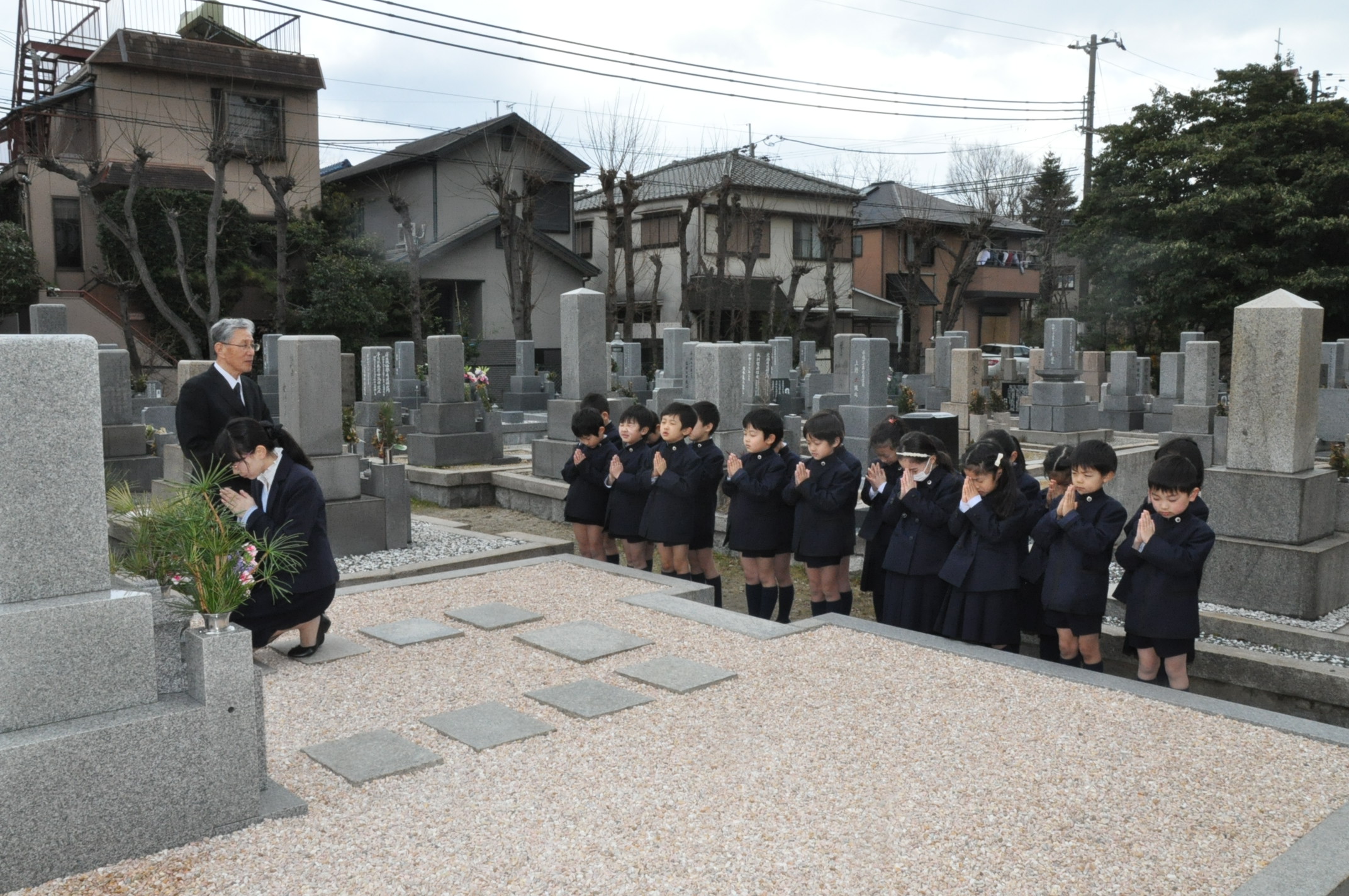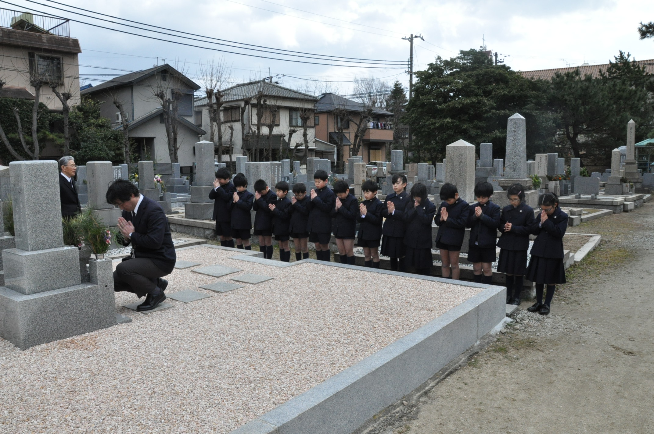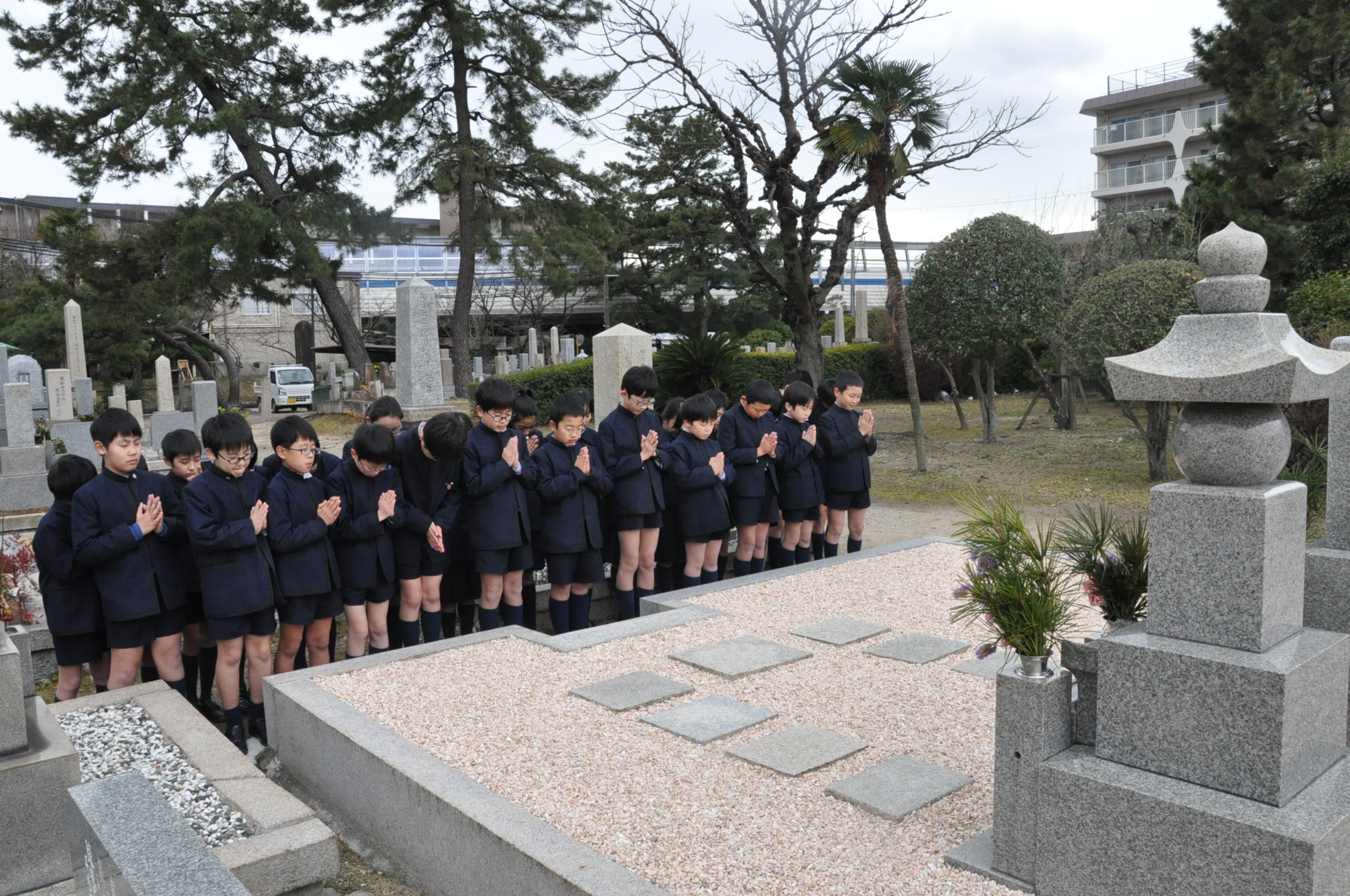 校祖先生と前学院長先生のお墓にお参りに行きました。先生方のご遺徳を偲んだ後、甲子園学院小学校の児童として、しっかり勉学に励むことをお誓いしました。