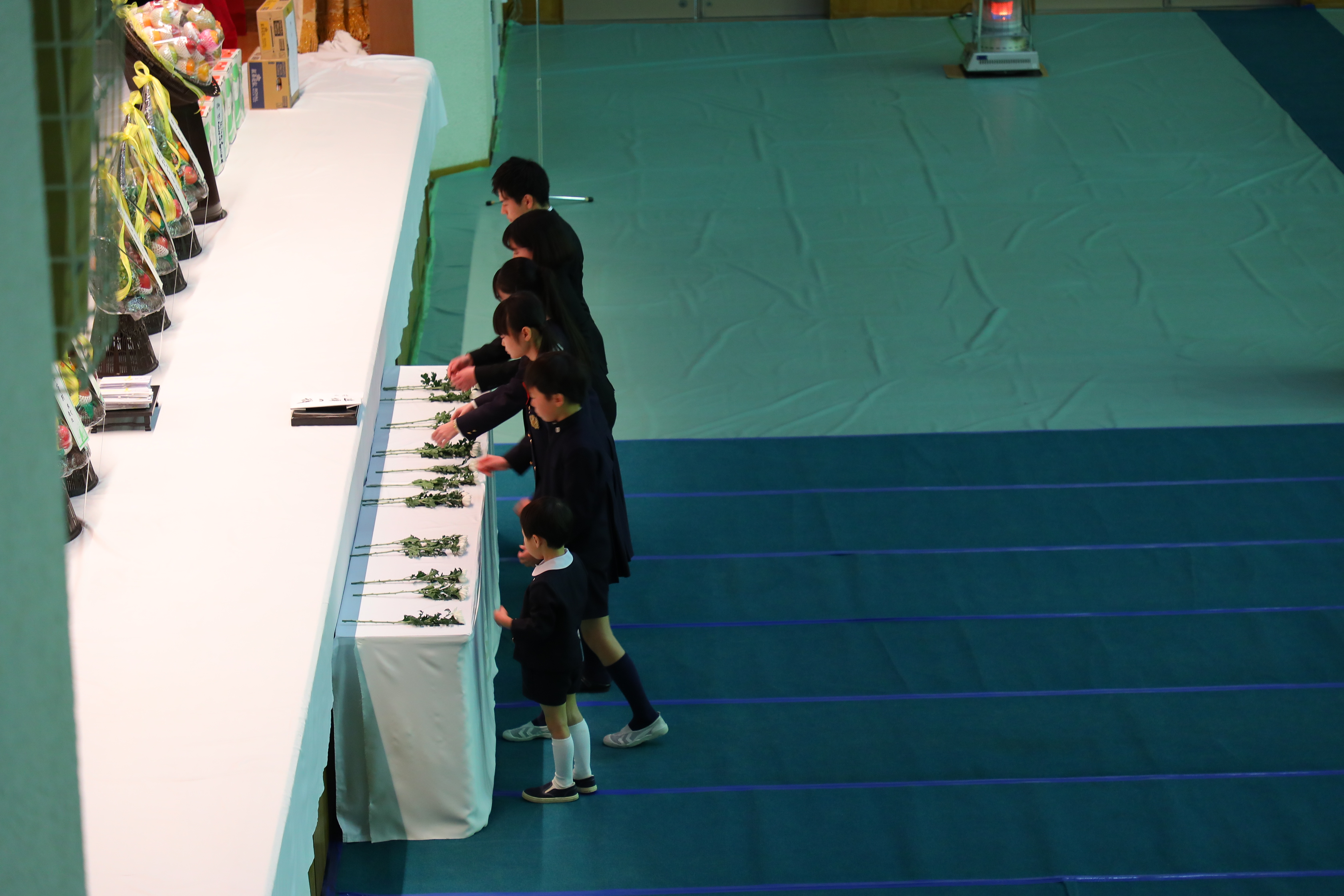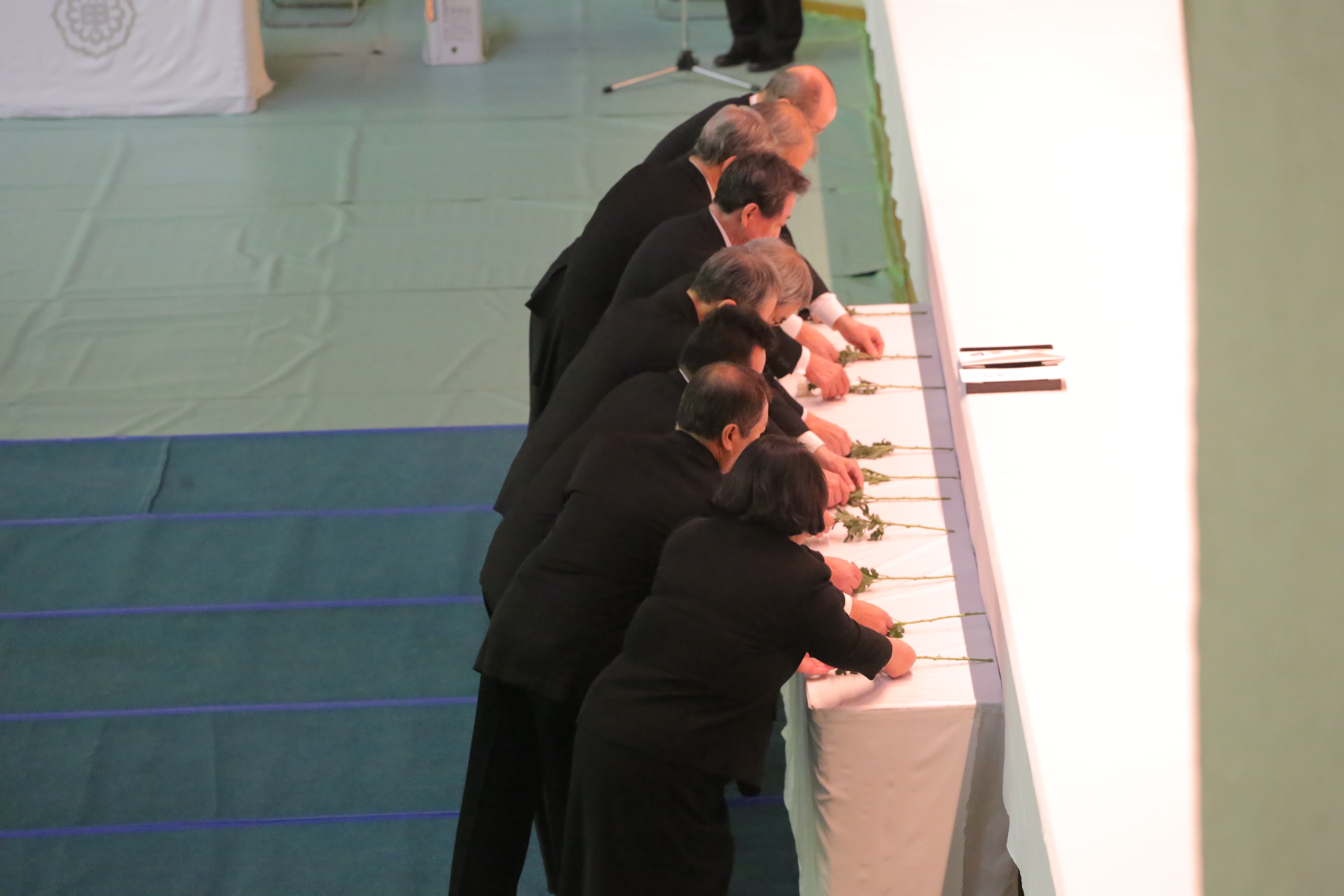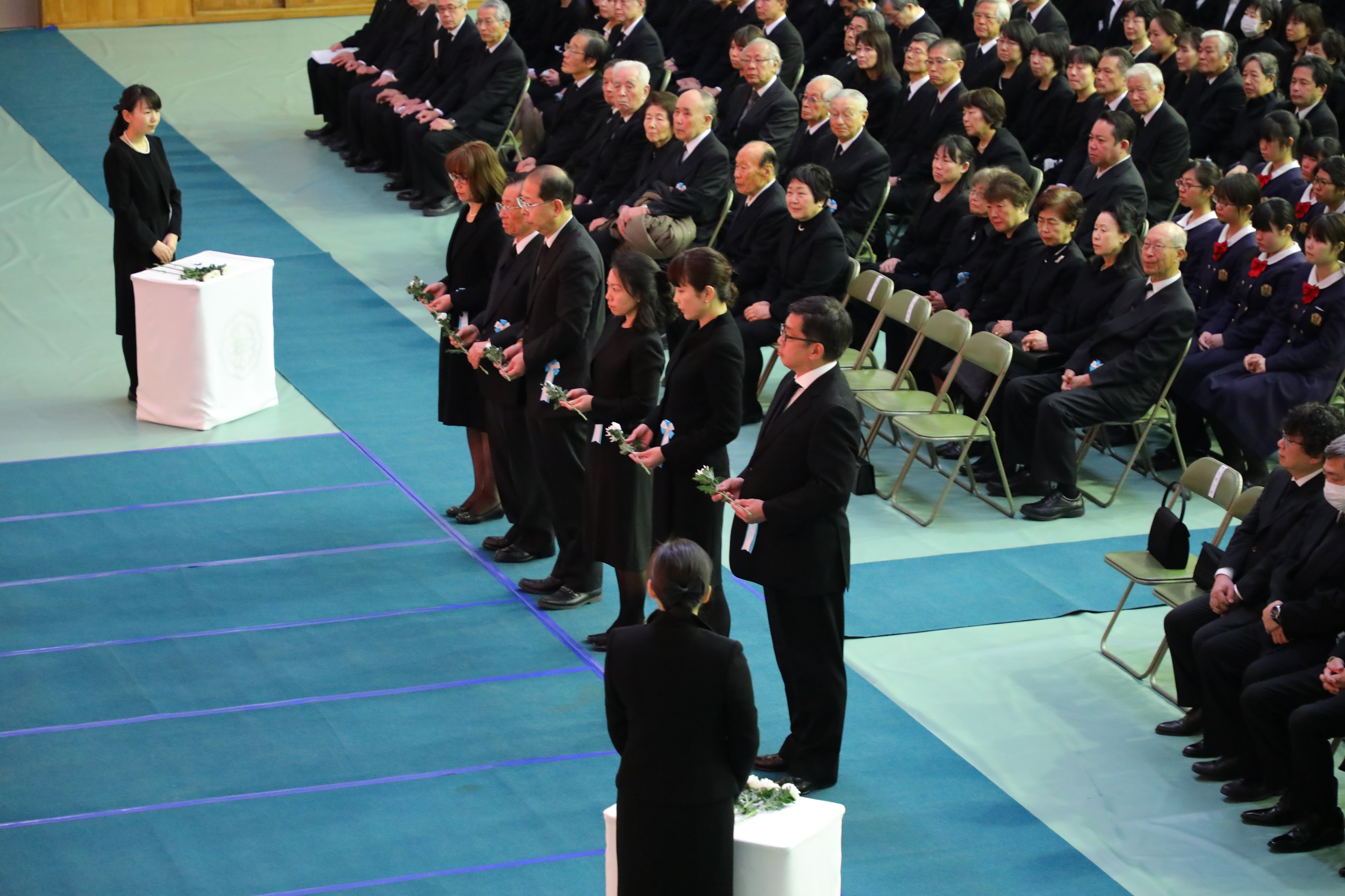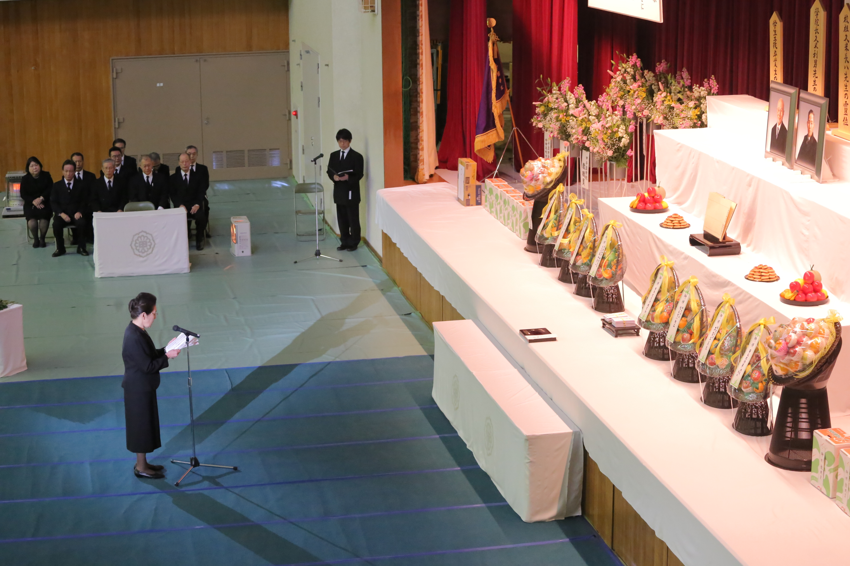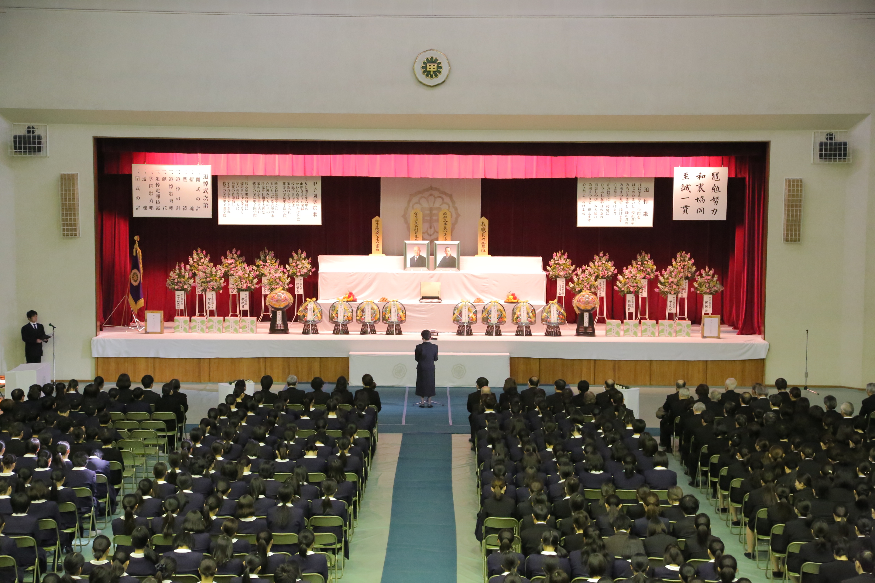 甲子園学院全校種が一堂に集まり,校祖久米長八先生,前学院長久米利男先生はじめ,学院関係物故者の追悼式を厳粛な雰囲気の中で行いました。代表による献花をしました。