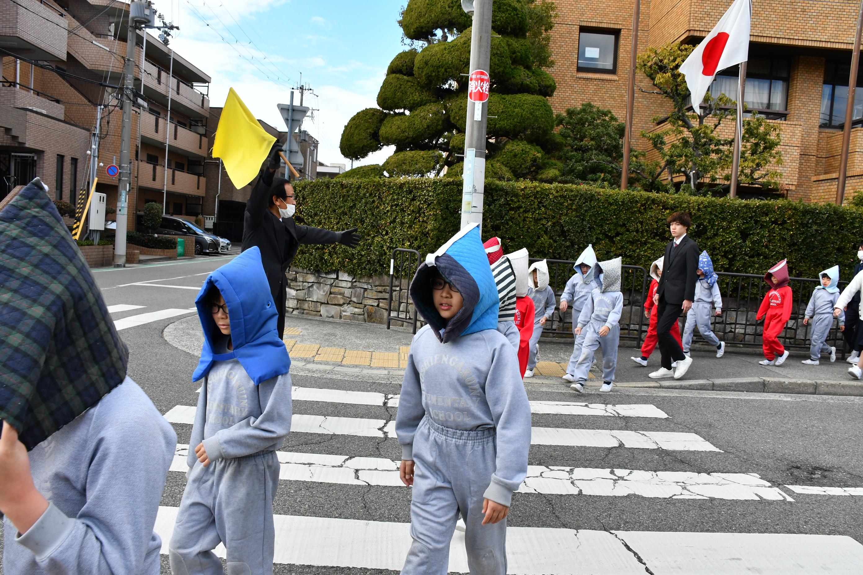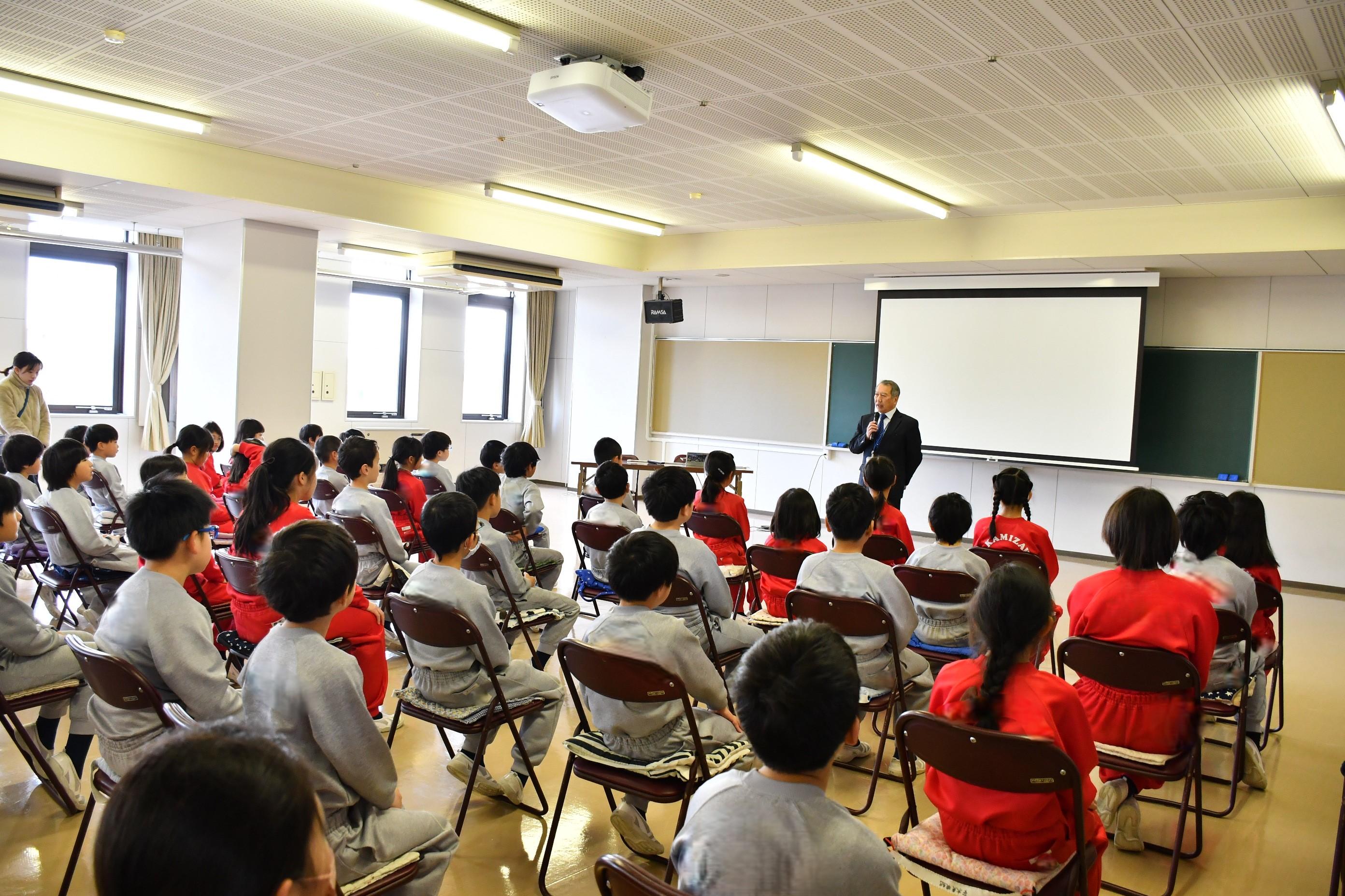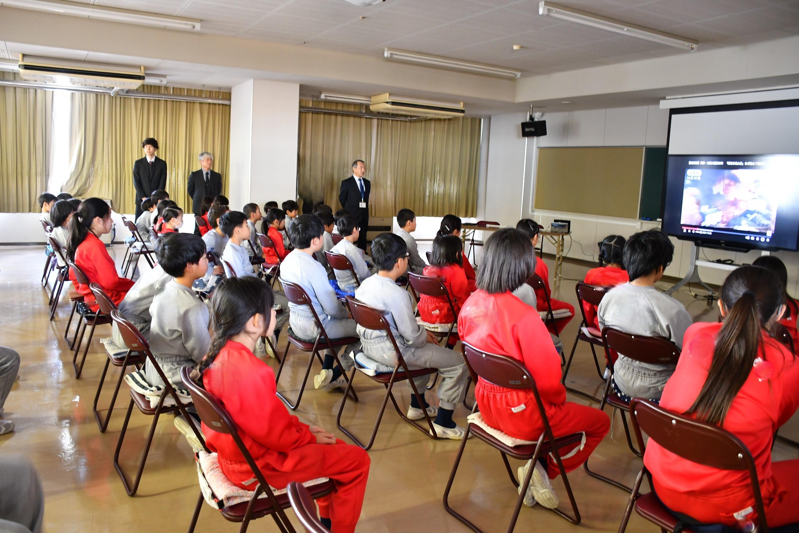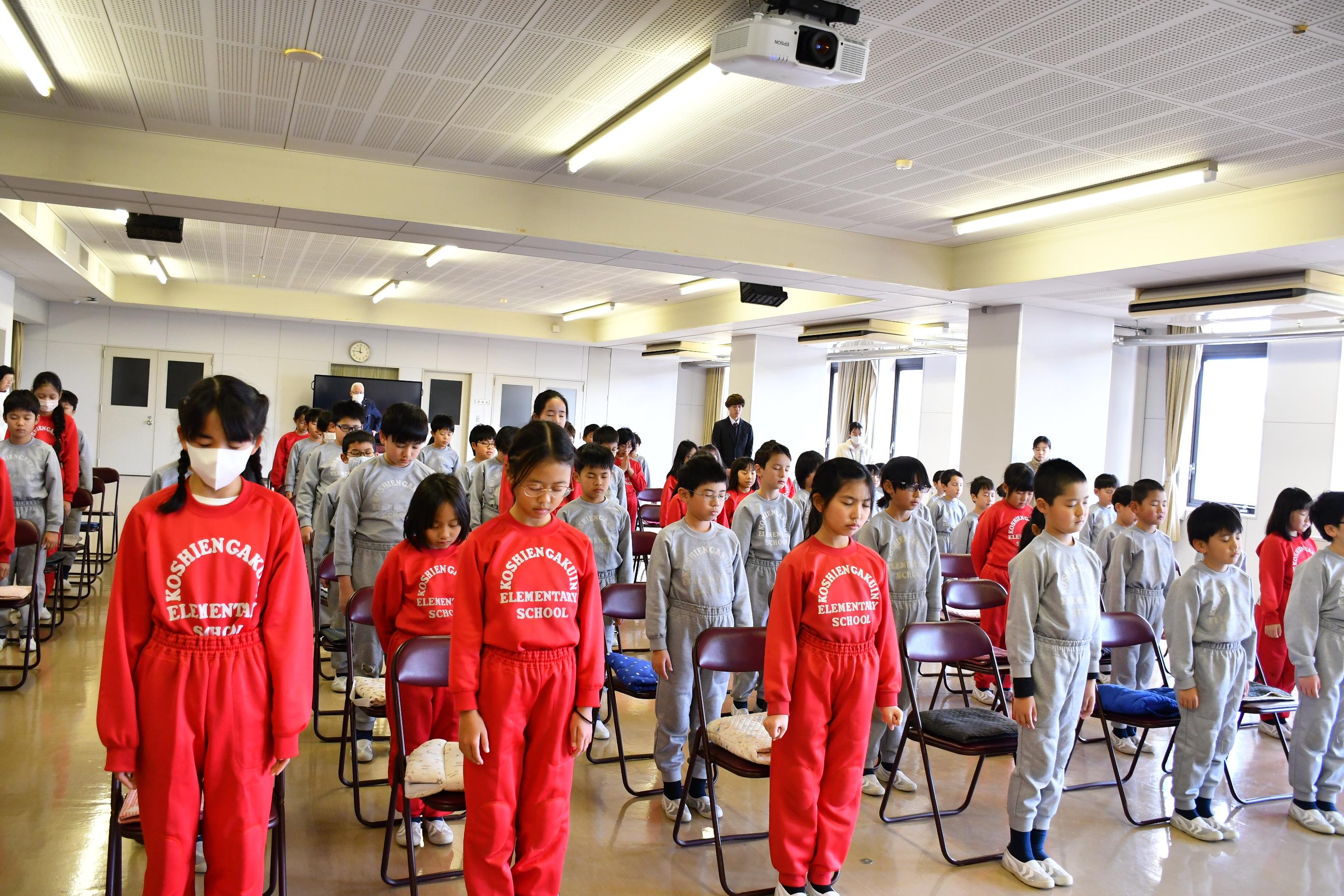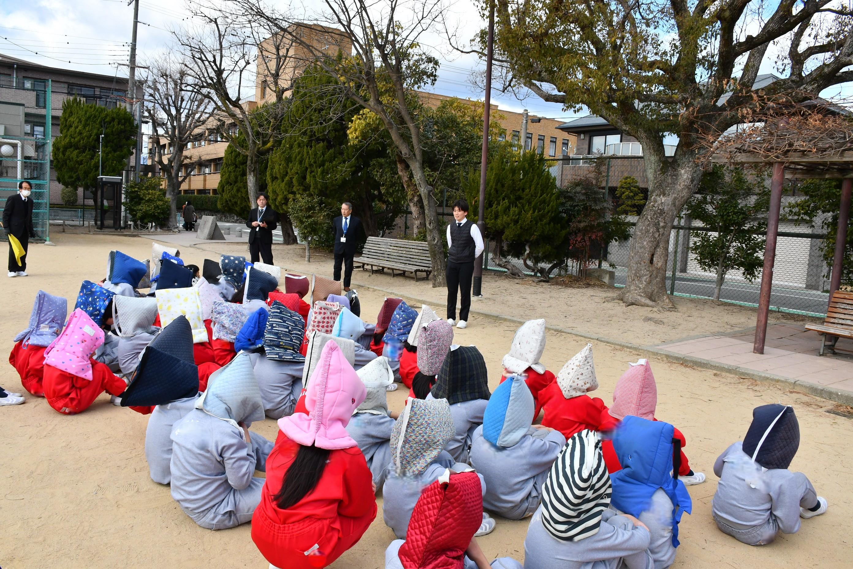 阪神淡路大震災から今年で30年。地震と津波を想定した避難訓練を実施しました。学校近くの公園へ一度避難し、大津波警報が発令させたことで、小学校の3階大教室に避難しました。大教室では、はじめに、震災の被害にあわれた方へ黙祷を捧げました。その後、校長先生からこれから震災にあったとき、情報を精査することが大事であるという話を聞き、震災当時の様子をまとめた動画を見て、被害の甚大さ、悲惨さを学びました。