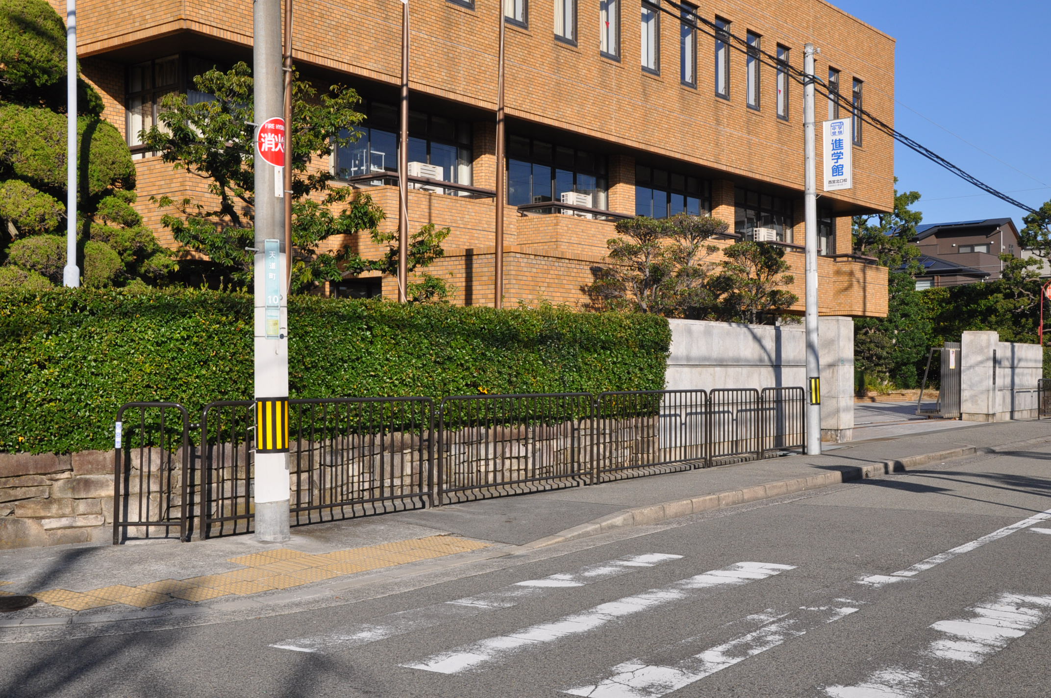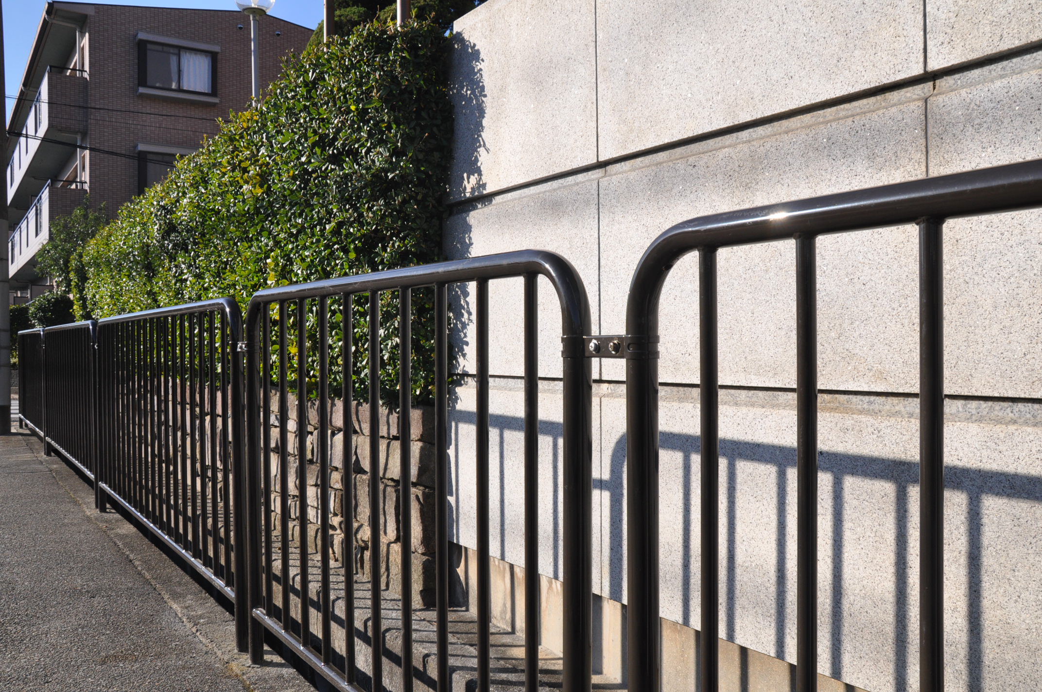 小学校正門前の歩道に防護柵が設置されました。側溝への落下を防ぐための安全対策に役立ちます。
