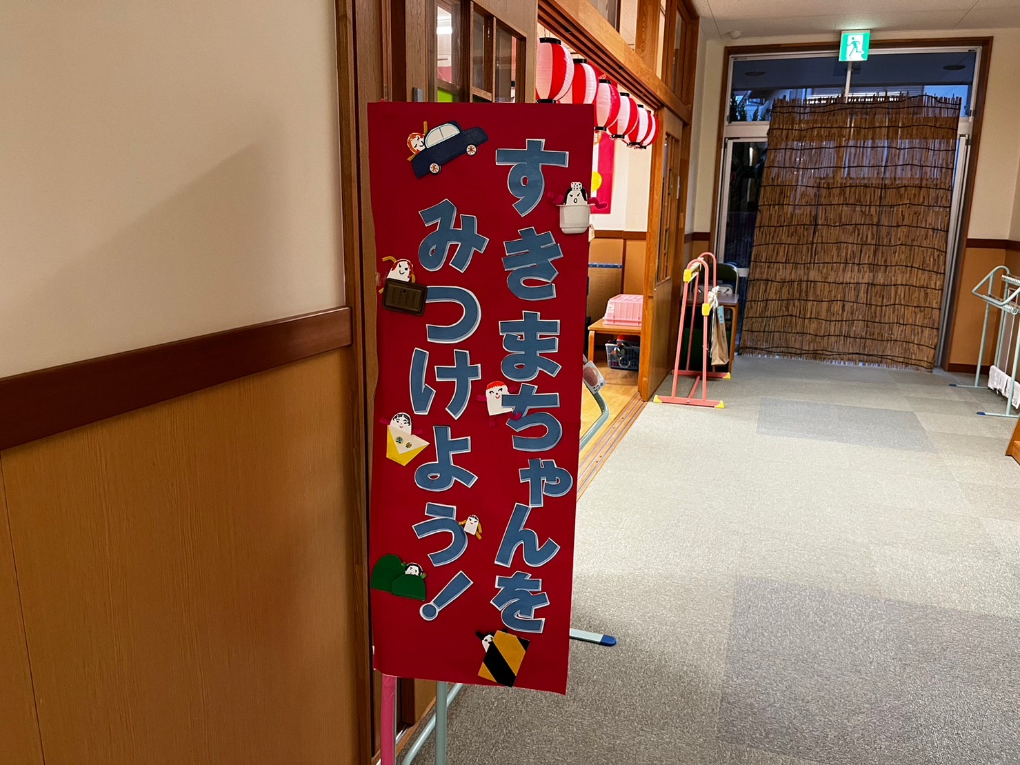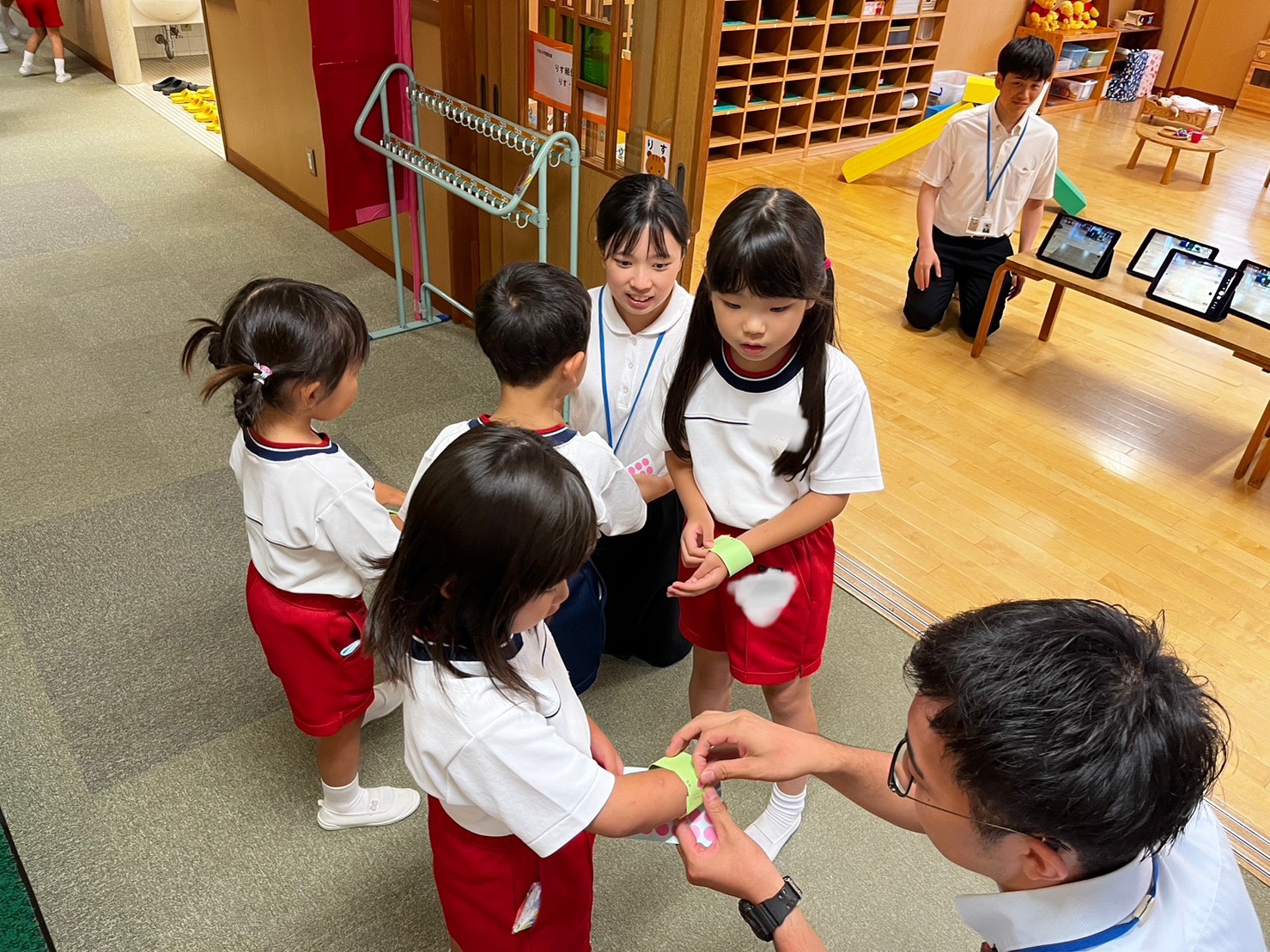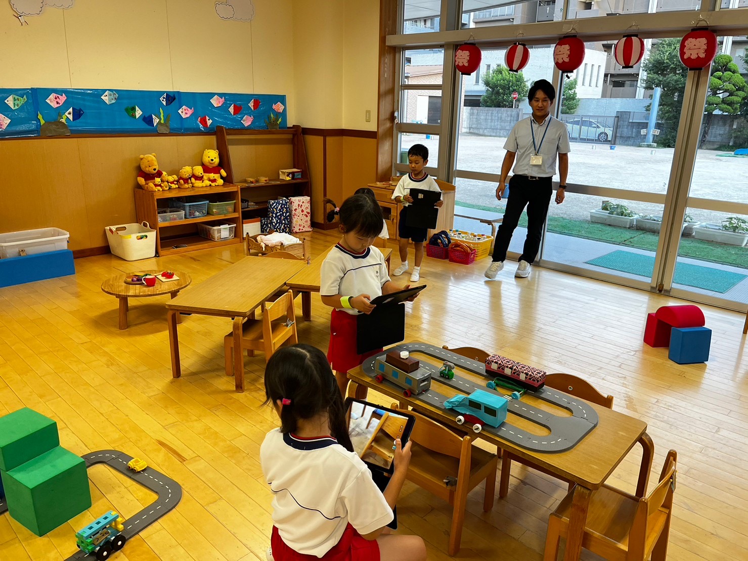 小学校の部屋は「すきまちゃんを見つけよう」というテーマ。保育室の中に隠れているすきまちゃんを見つけて、タブレットで写真を撮影する活動でした。参加した年長児たちは、上手にタブレットを使いこなし、みんな撮影に成功しました。