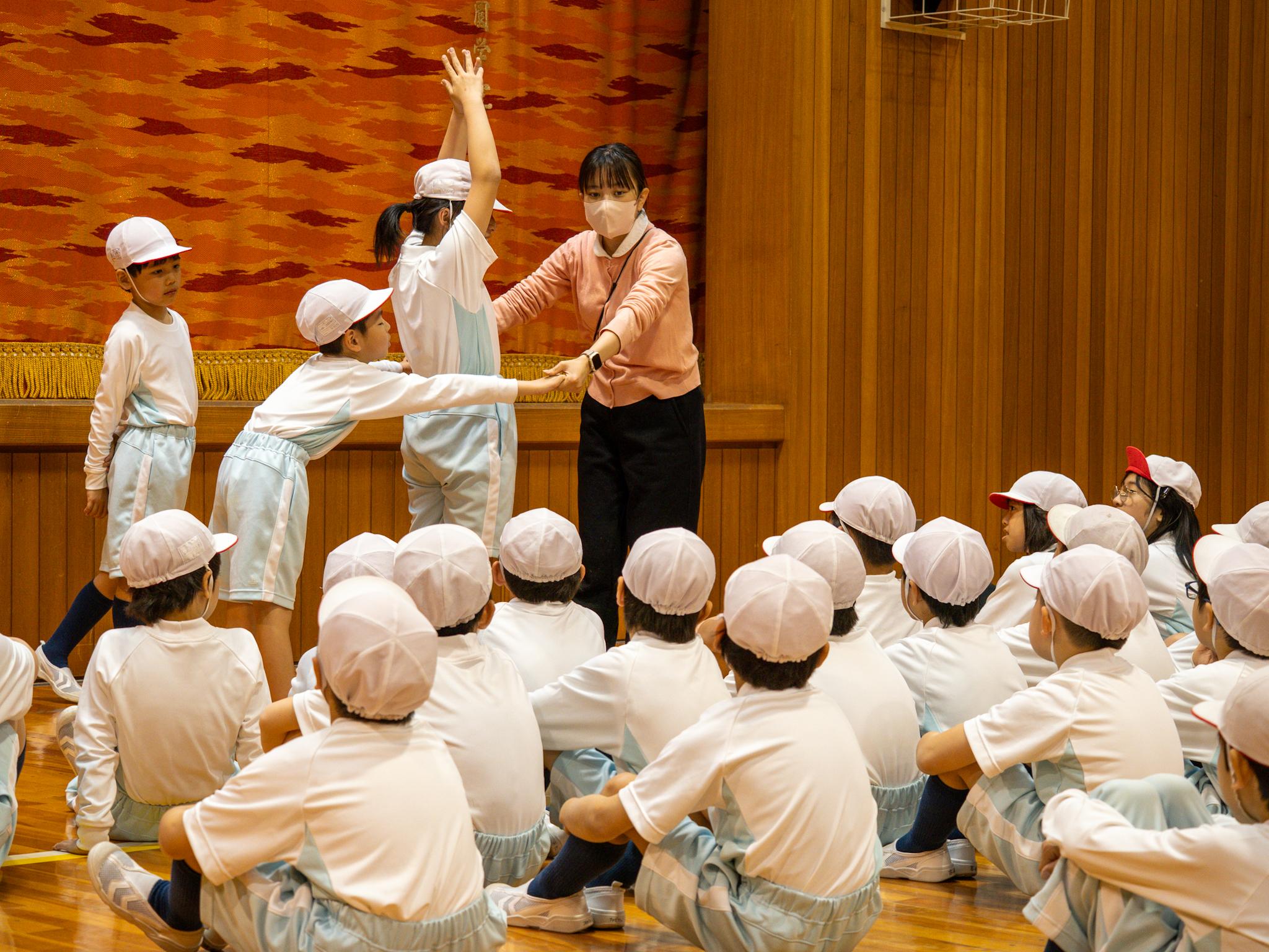 前半の「体つくり運動」では、友達とタイミングを合わせたり、体全体を巧みに動かしたりする運動に挑戦。4年生のきびきびとした動きをお手本にしながら、3年生も一生懸命に体を動かしていました。