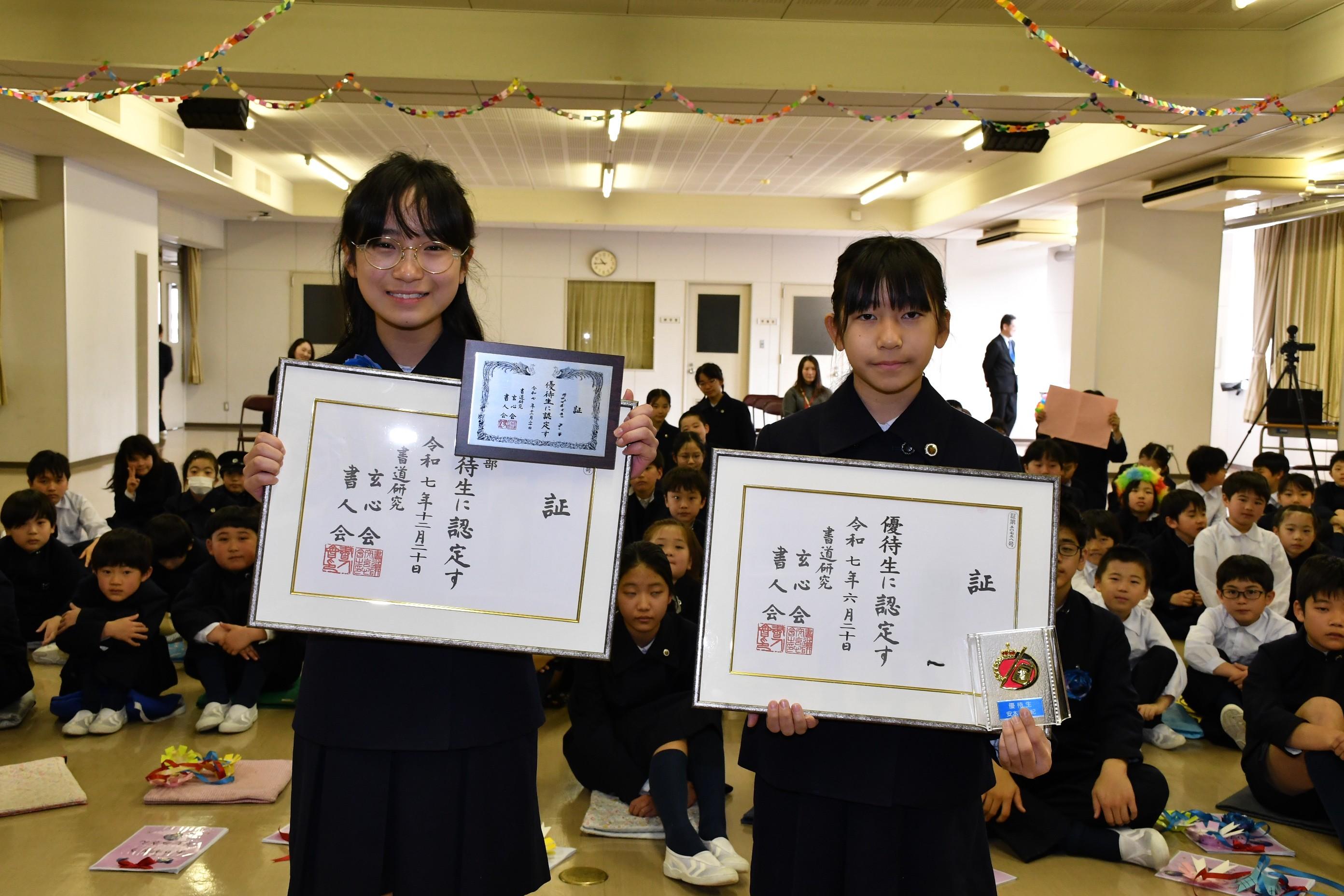 また、習字クラブの6年生児童2名には優待生の表彰を行いました。