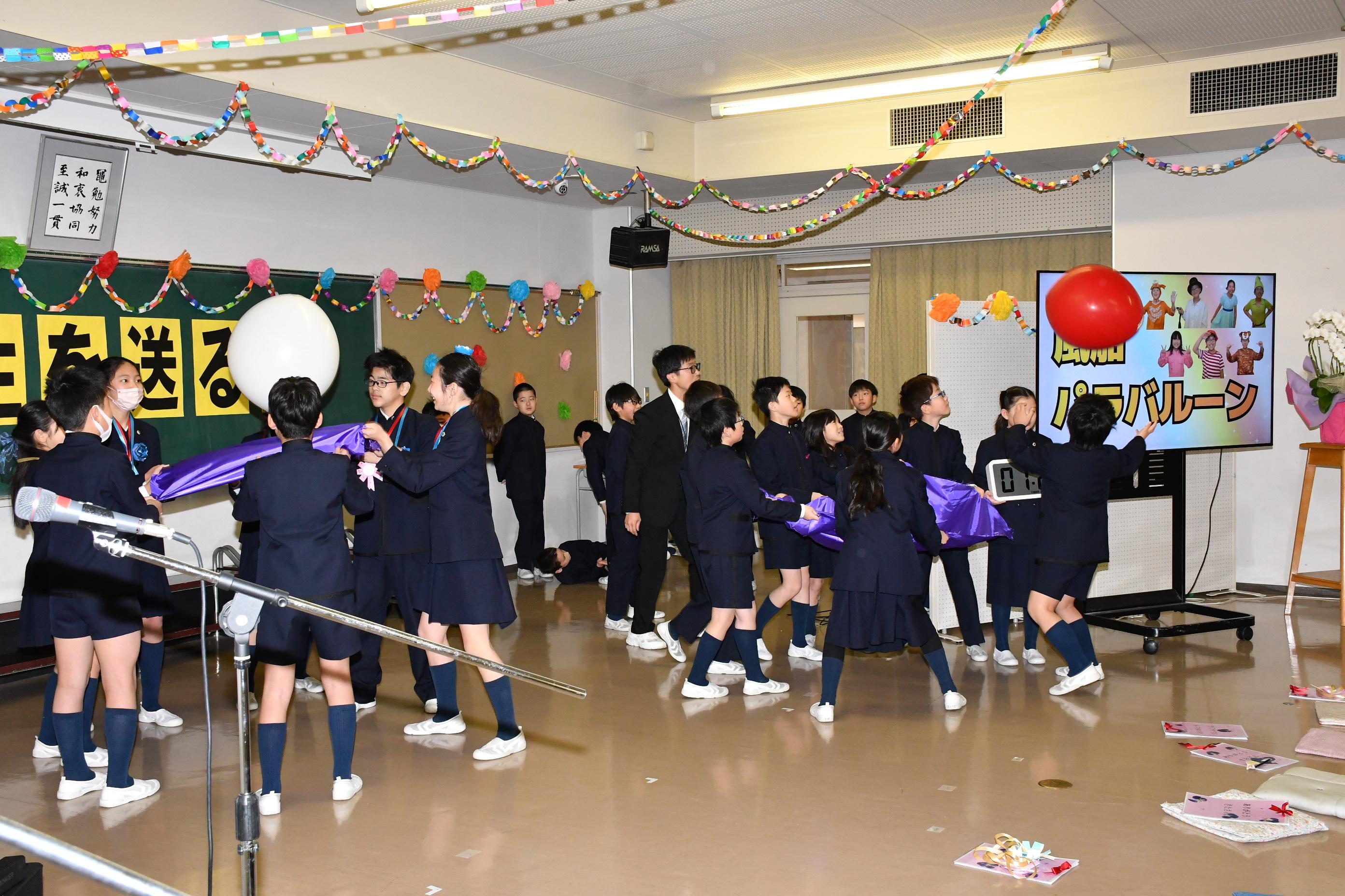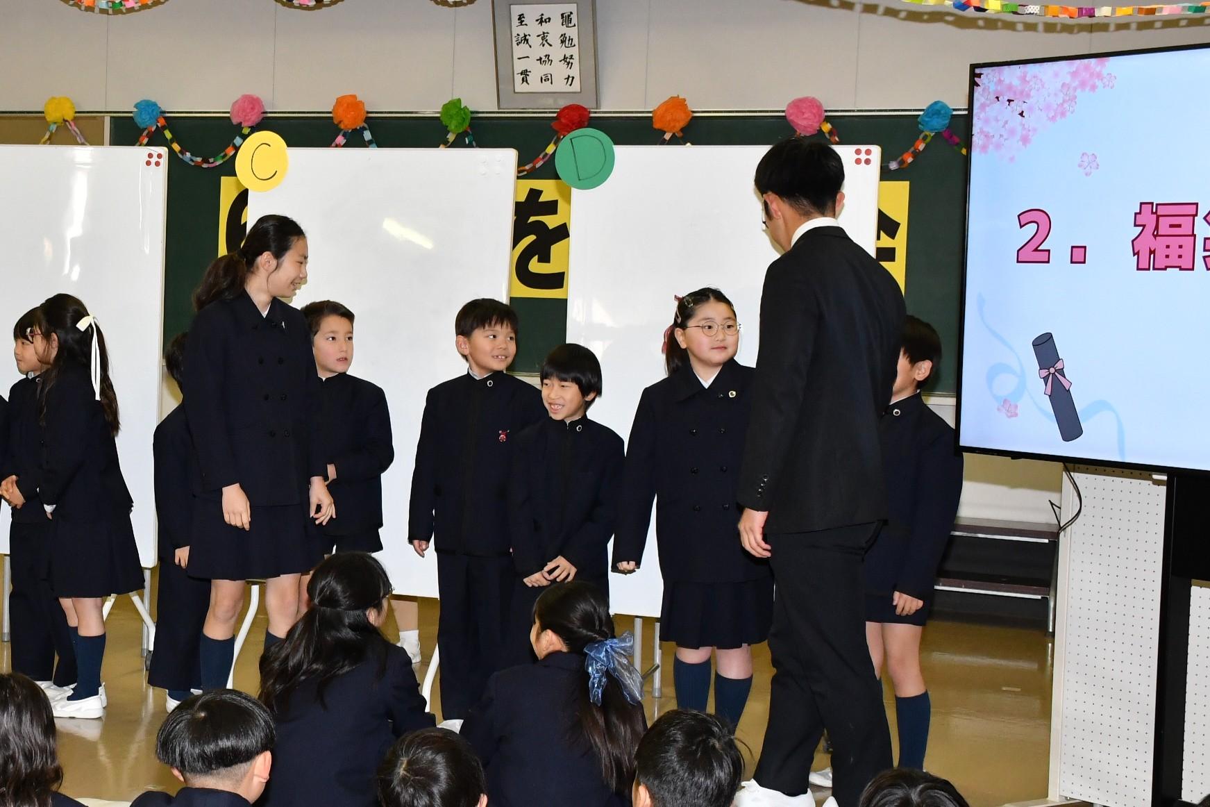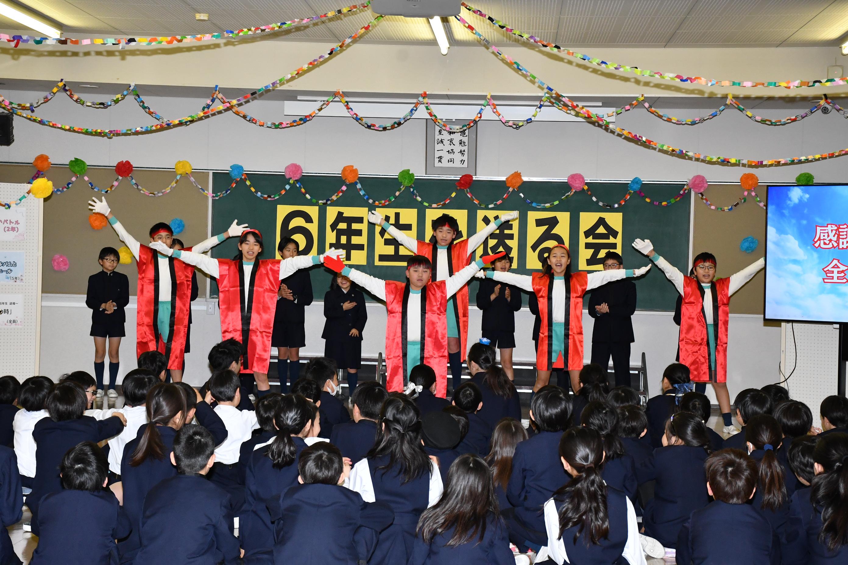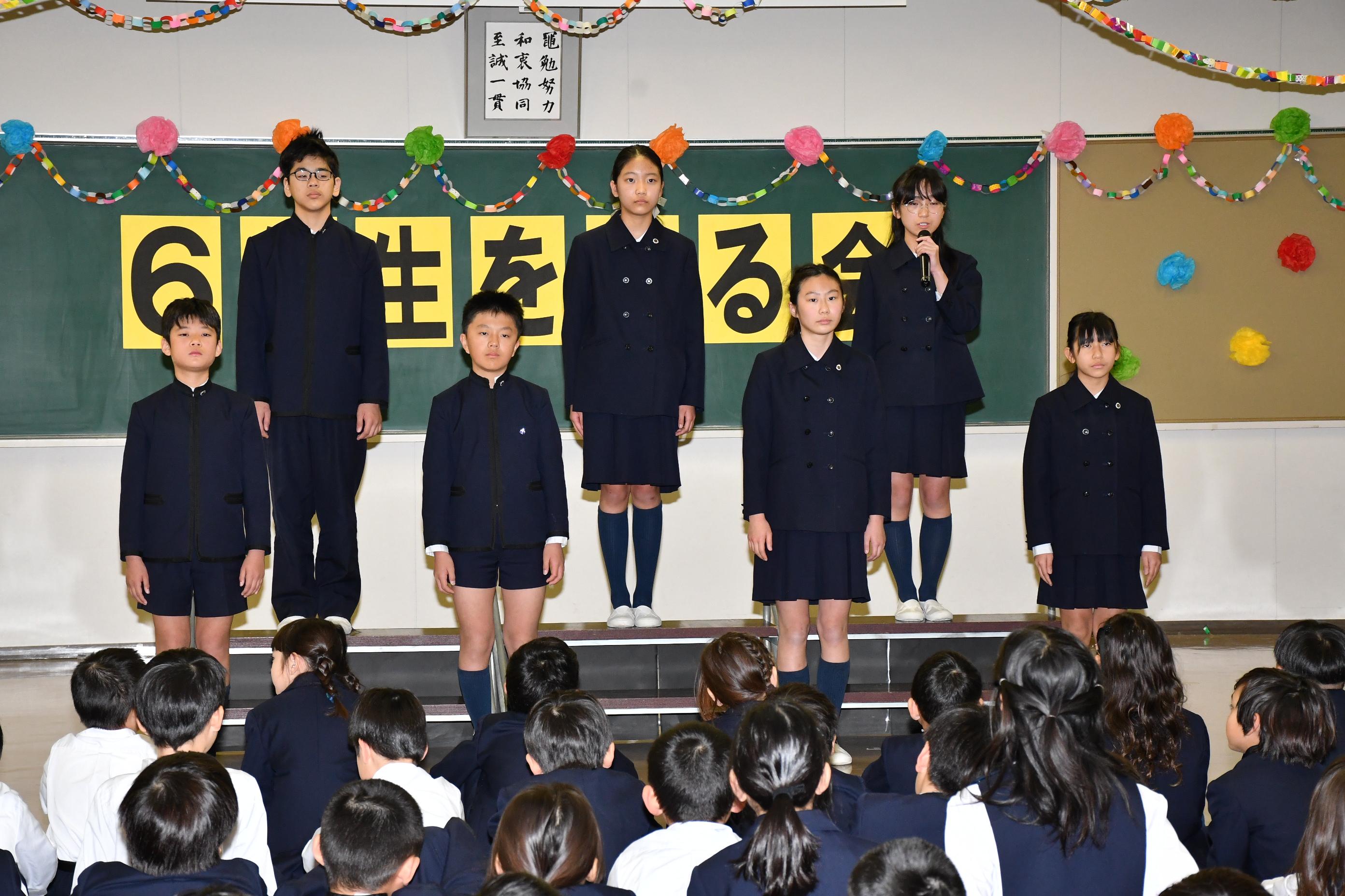 3月6日(金)、6年生を送る会を行いました。各学年が、6年生に楽しんでもらえるように一生懸命考え、練習した歌やゲーム、クイズ、劇などを披露しました。最後には、6年生が一人ひとり卒業宣言を行いました。