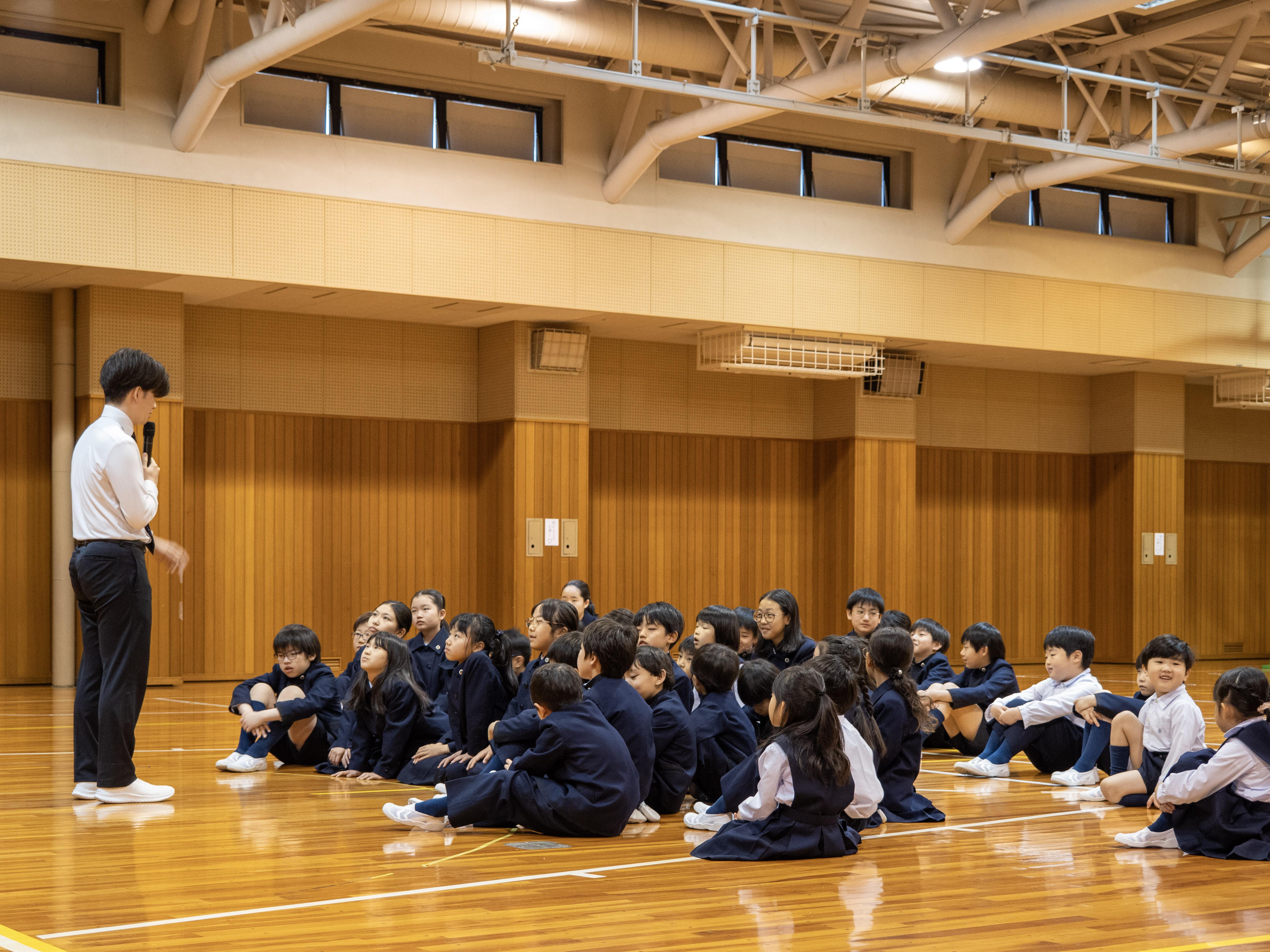 児童朝礼の後、下校指導を実施しました。徒歩や各公共交通機関別に分かれて、登下校中のマナーについて話を聞きました。