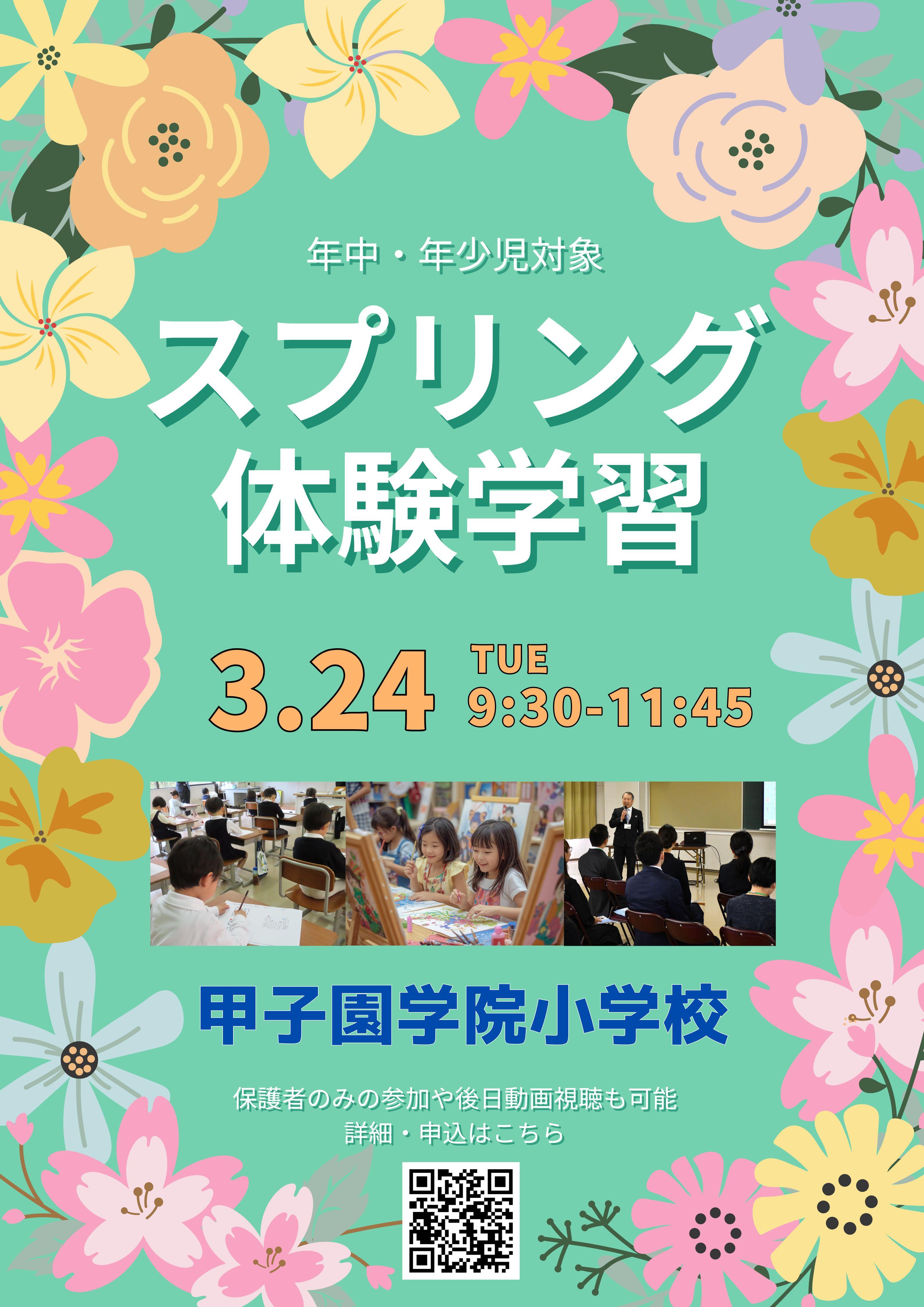 令和8年3月24日(火)に、年中・年少児を対象とした「スプリング体験学習」を実施いたします。私立小学校に興味のある方はお気軽にご参加ください。